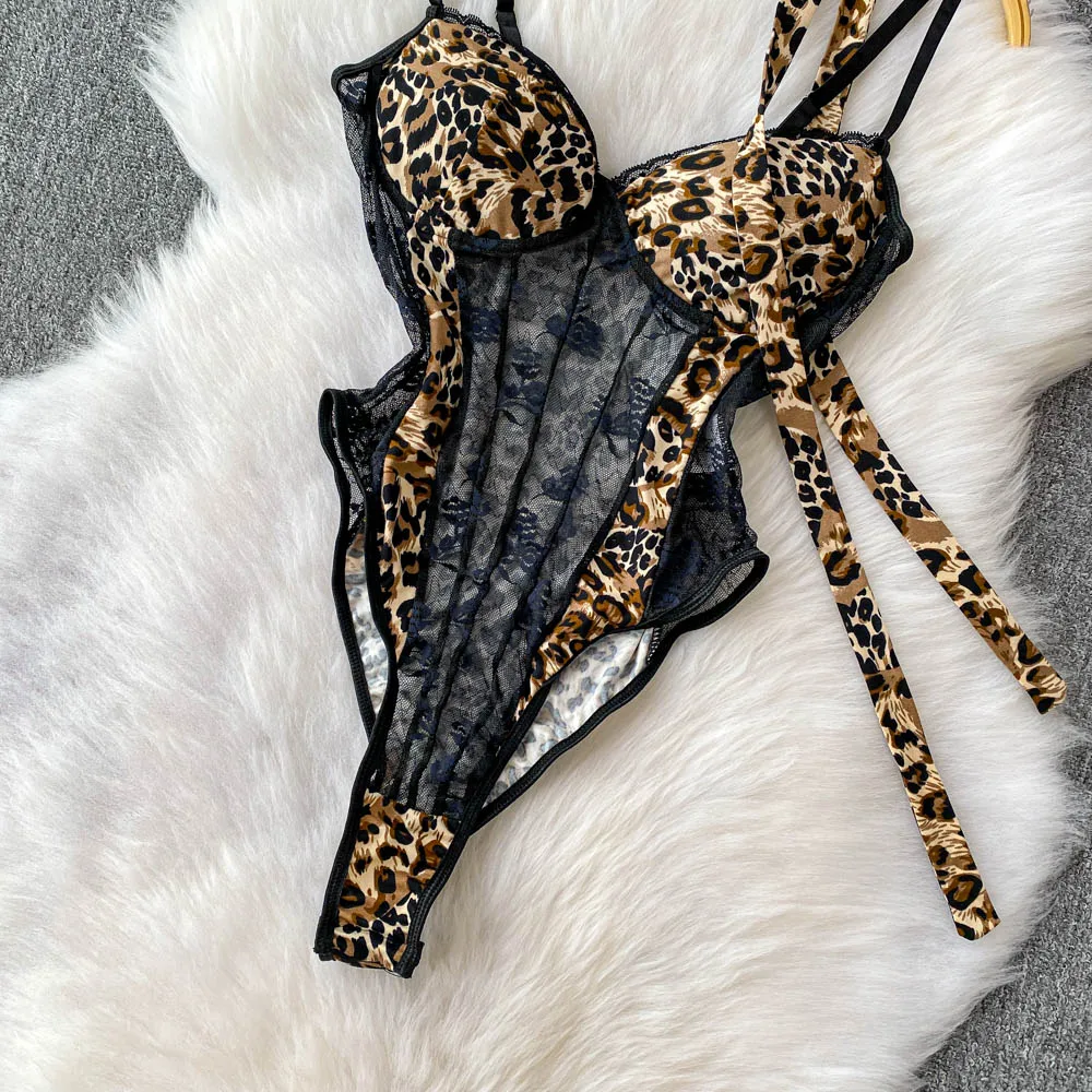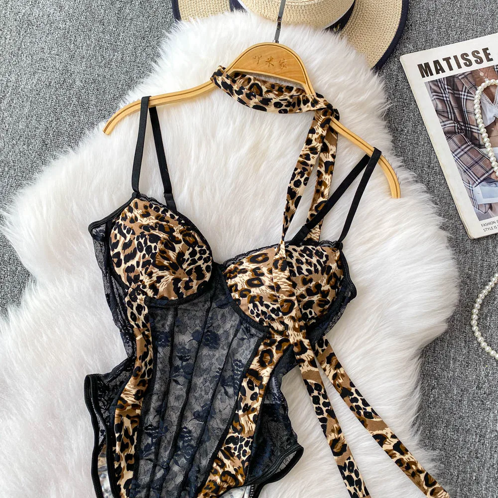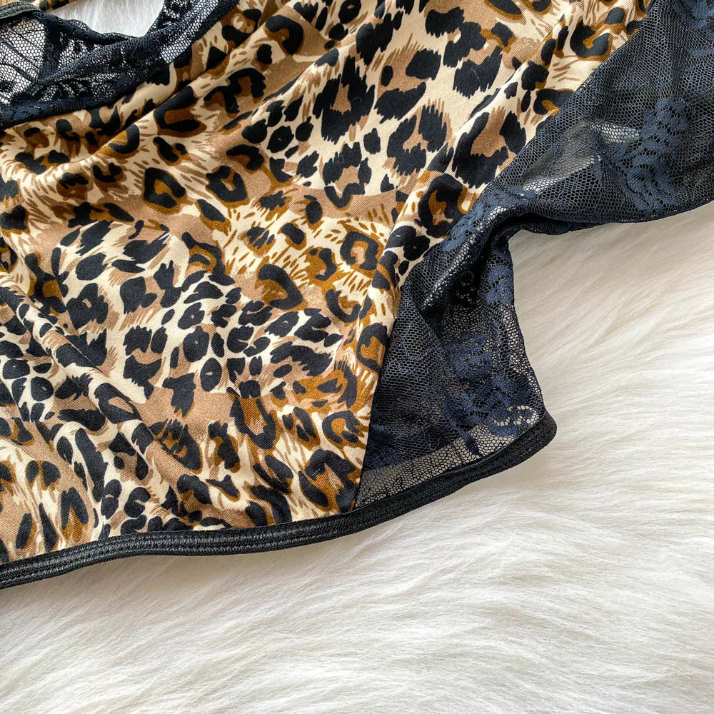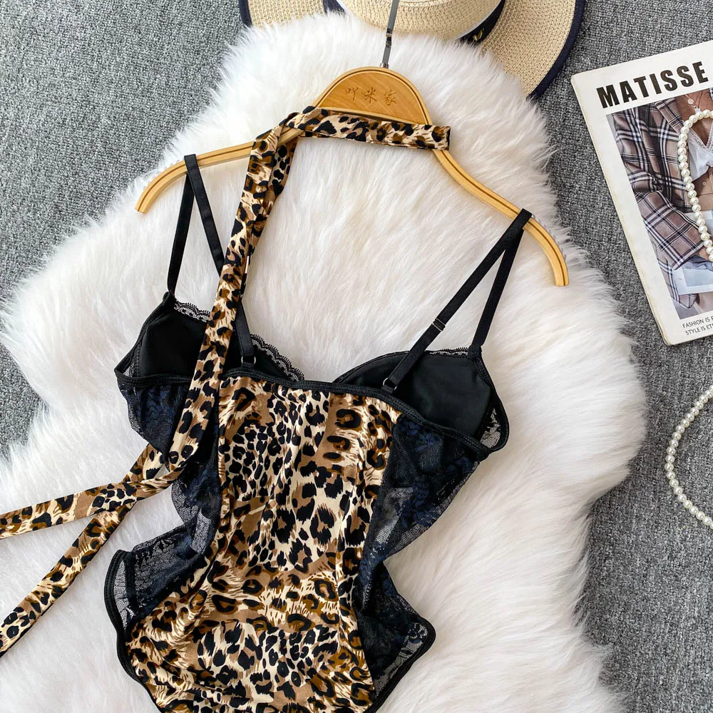 Women Hotsweet V-neck leopard slim Vintage Straps Bodysuits Chic lace Jumpsuits Slim Top Clothing