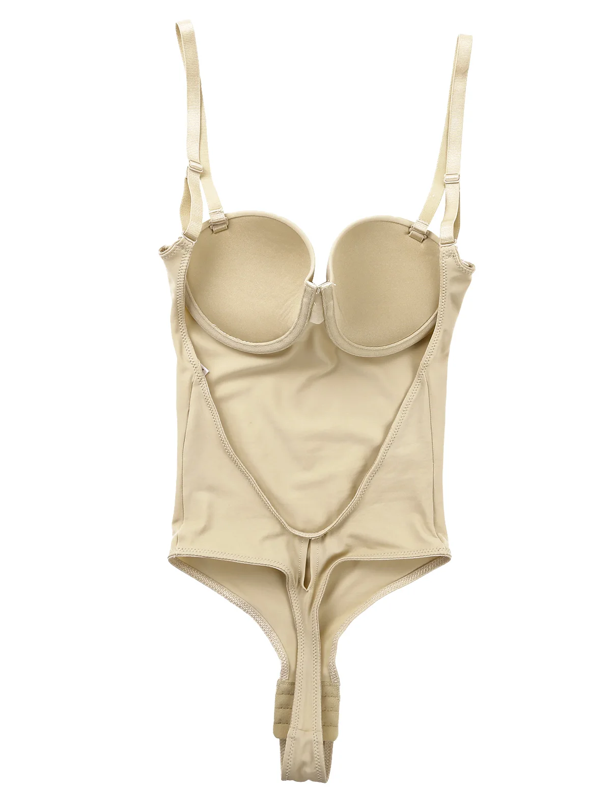 Backless, detachable adjustable shoulder straps can also convert to criss-cross, underwire padded cups provide a lift for your breast. A very convenient 3 rows of hook and eye closures at crotch.