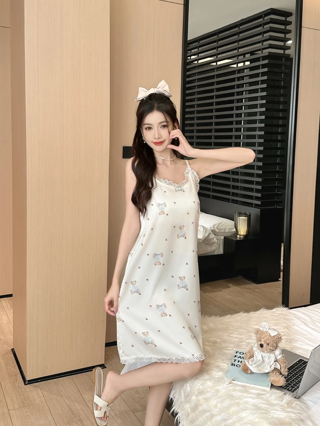 women's satin skirt cute bear nightdress Summer silk pajamas sexy women pendant nightgown lace elegant silk ladies home wear |