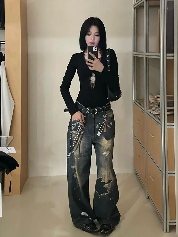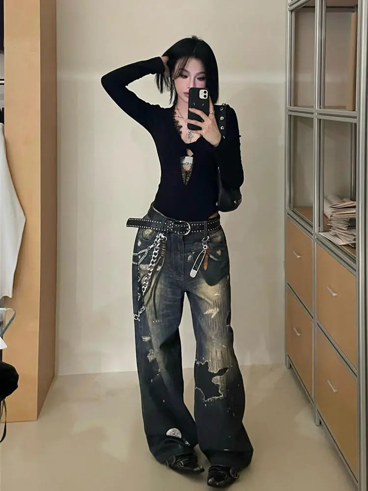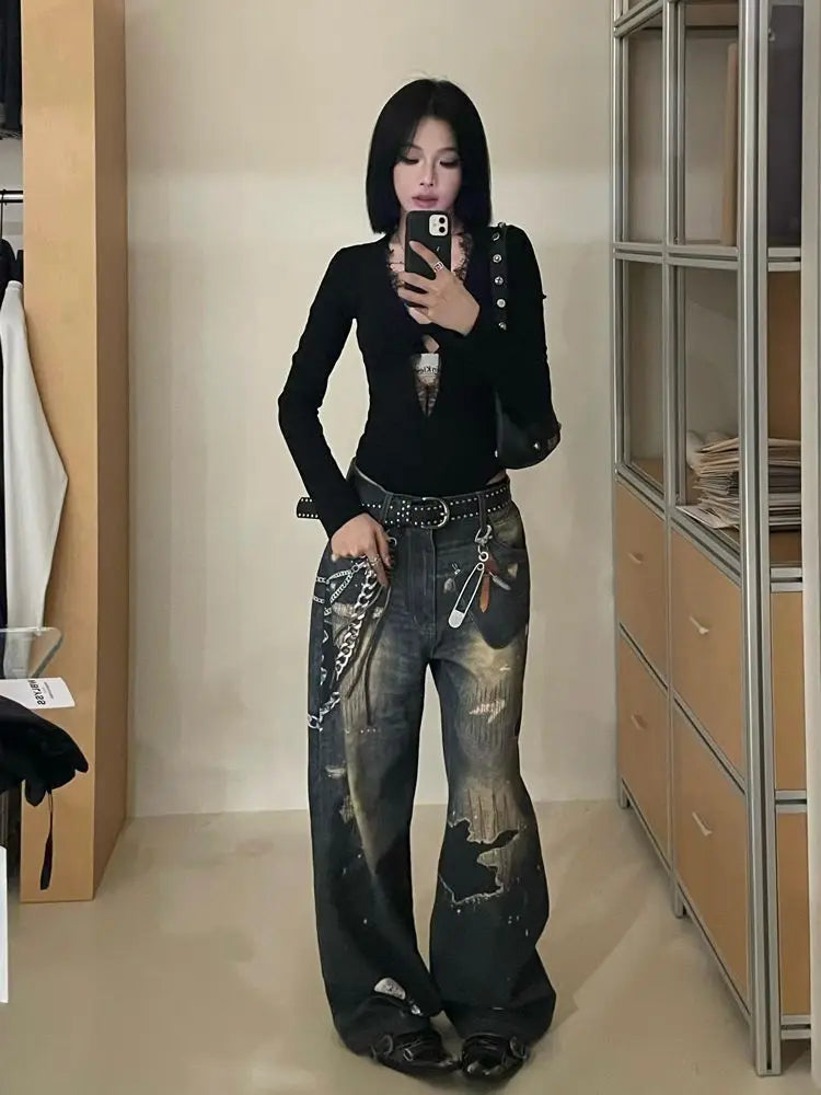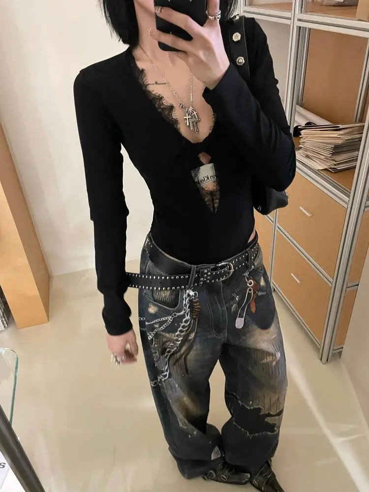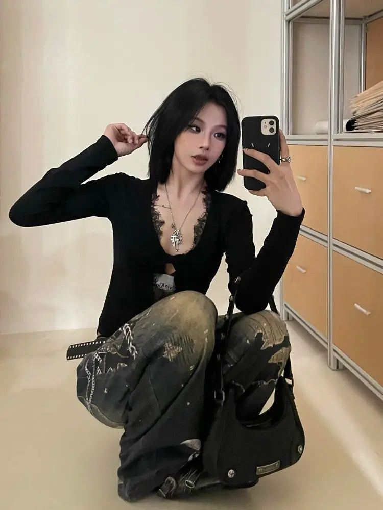 Gothic Black Lace Mesh Bodysuit for Women Y2K