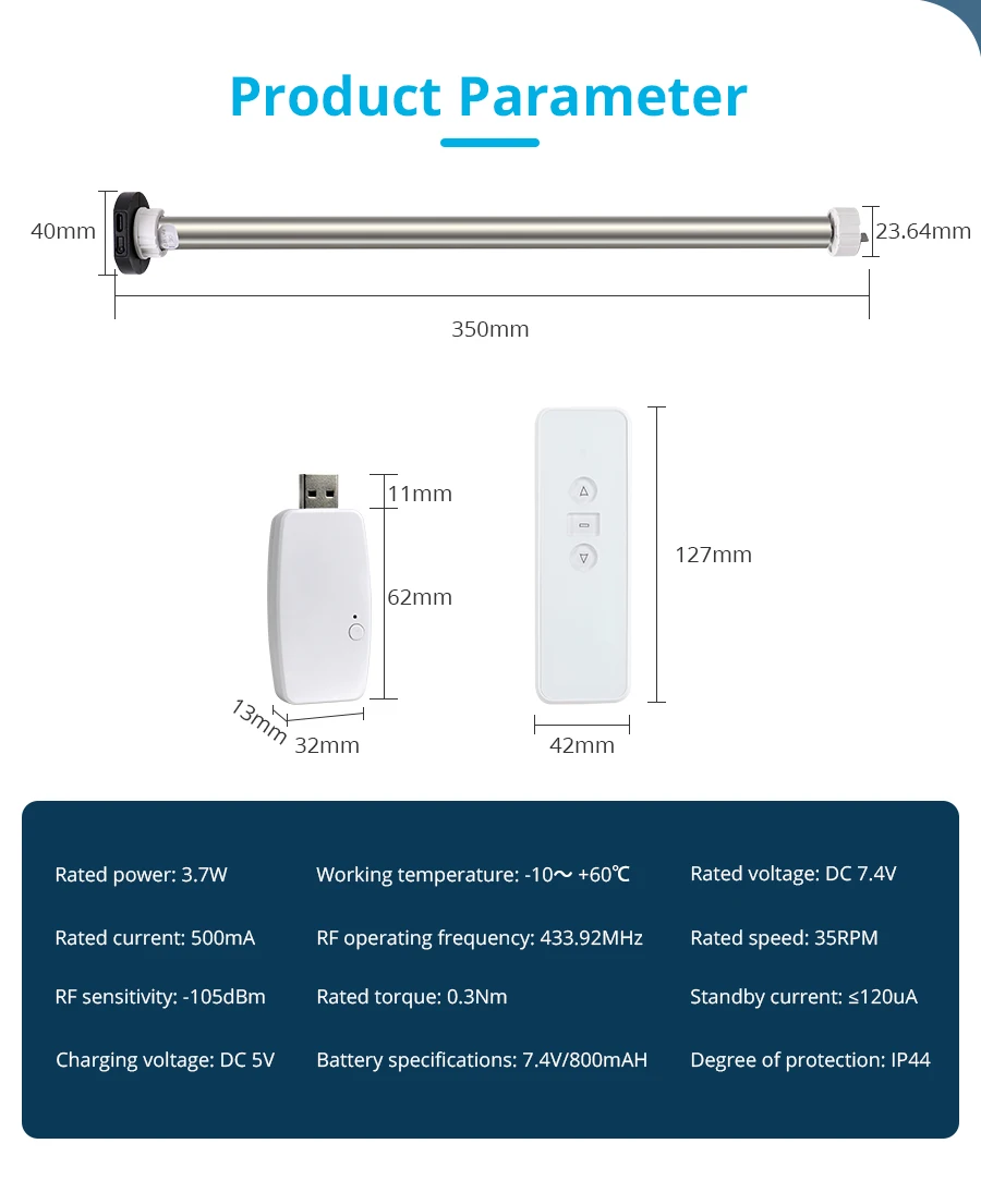 - Built-in RF remote control, easy to install and set up, reduce workload. widely used in indoor hollow blinds, indoor small aluminum, wooden blinds, etc., with electronic limits.