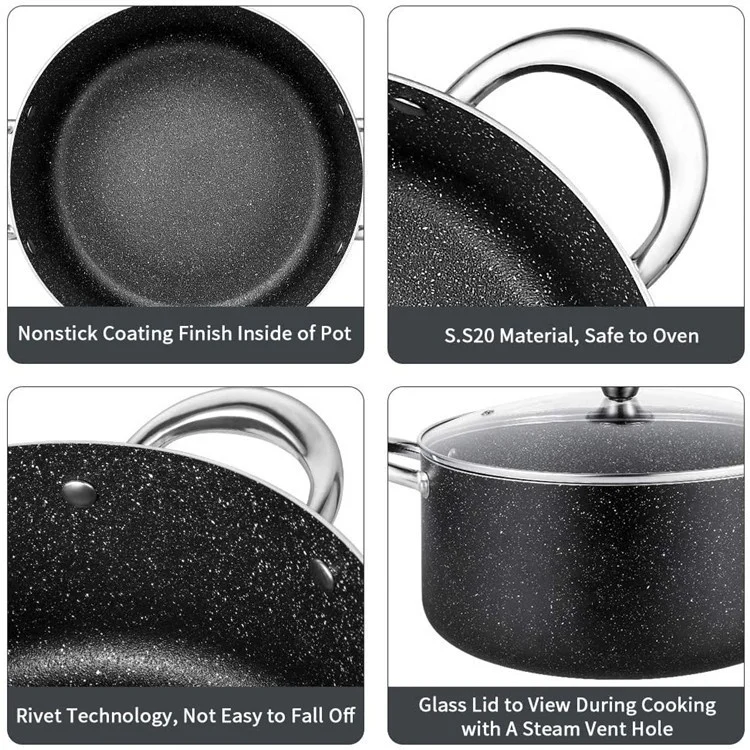Khám phá bộ nồi 10PCS cổ điển, được thiết kế tinh xảo cho căn bếp hiện đại của bạn. Bộ nồi này bao gồm đáy kép bằng đồng và bề mặt nhôm bắn cát, mang lại sự bền bỉ và hiệu suất tối ưu cho việc nấu ăn hàng ngày. Với lớp phủ đá hoa cương, bộ nồi không chỉ chống dính mà còn dễ dàng vệ sinh. Được sản xuất theo yêu cầu, đây là sự lựa chọn hoàn hảo cho những ai yêu thích nấu ăn và quan tâm đến môi trường. Biến bữa ăn gia đình thành những khoảnh khắc đáng nhớ ngay hôm nay!