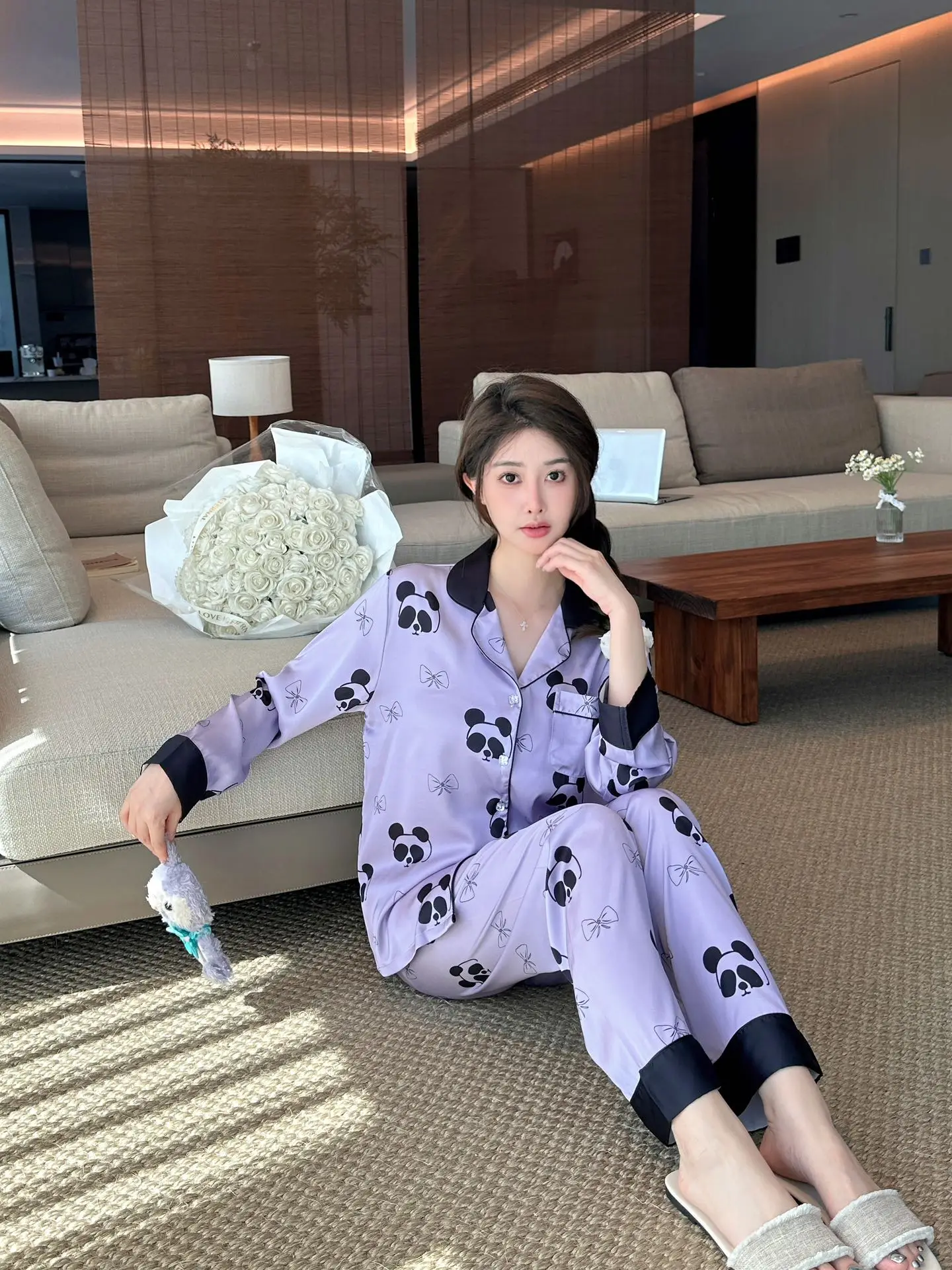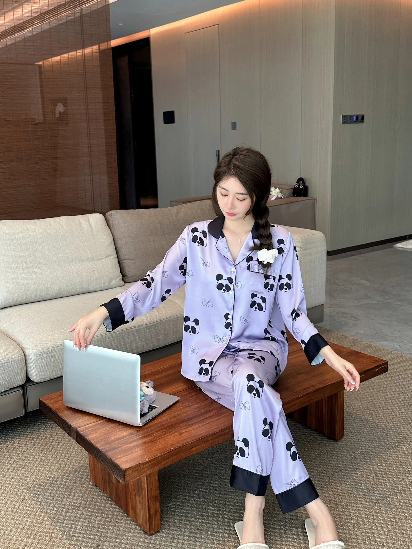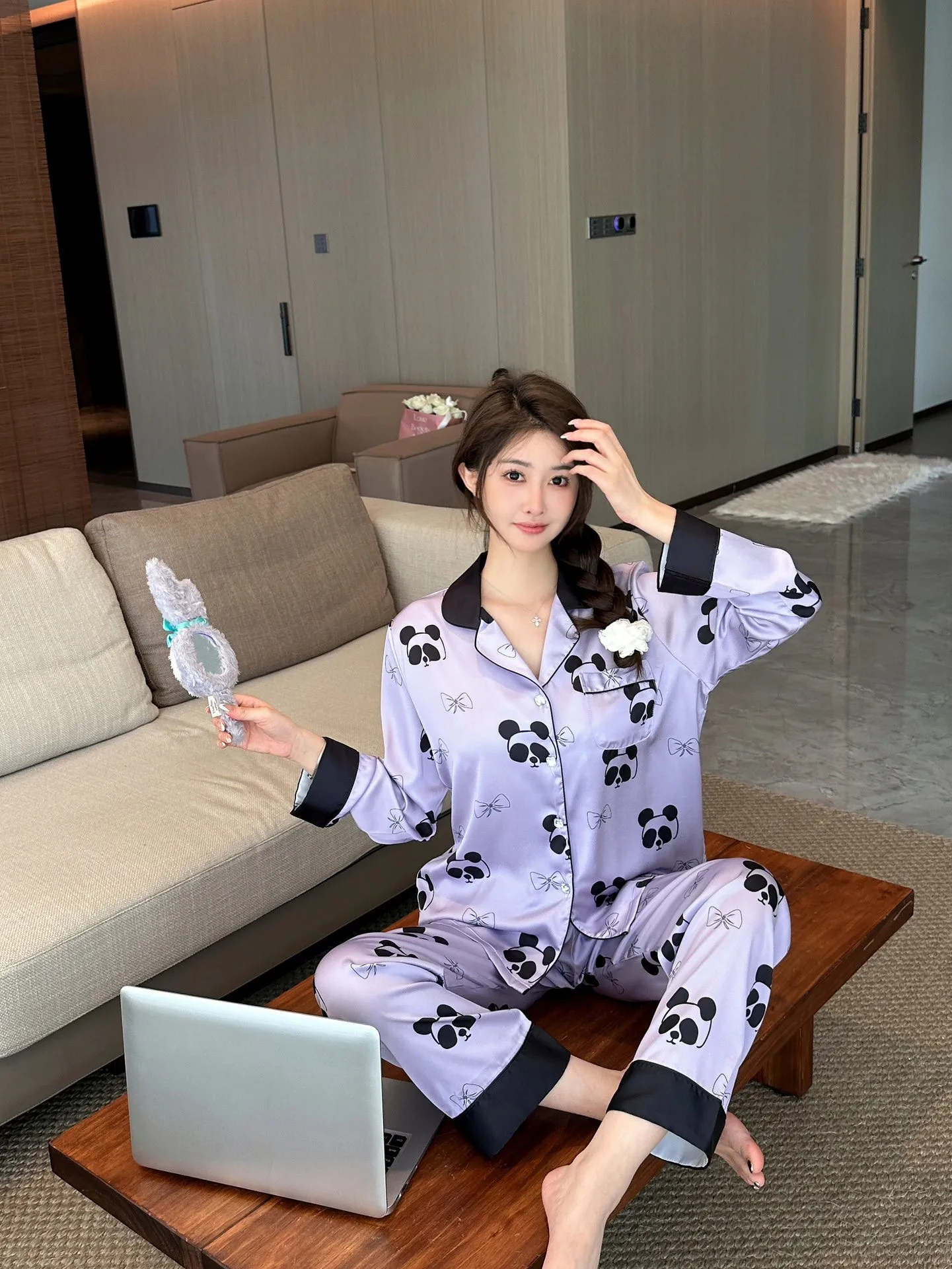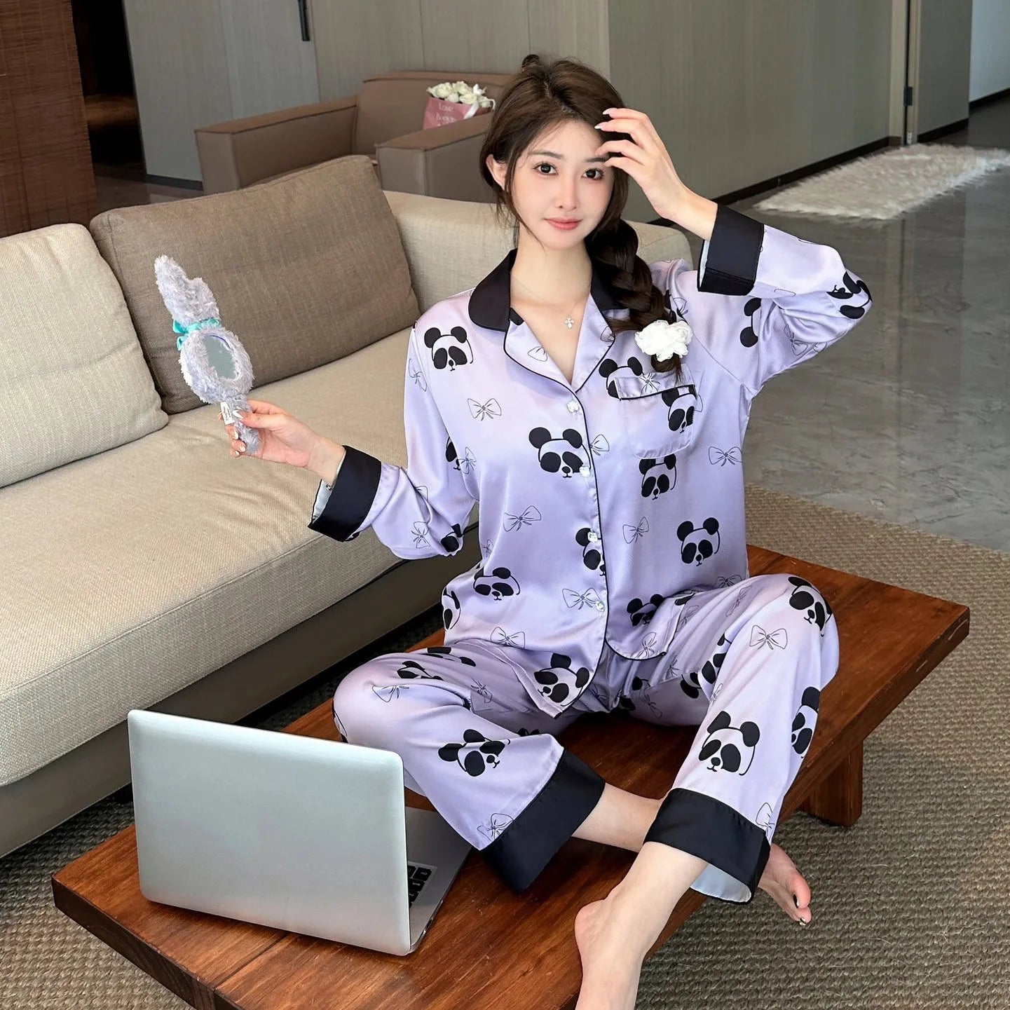 2024 fall new women's ice silk pajamas V-neck thin trousers long sleeve night suit purple panda cartoon print ladies' home wear |