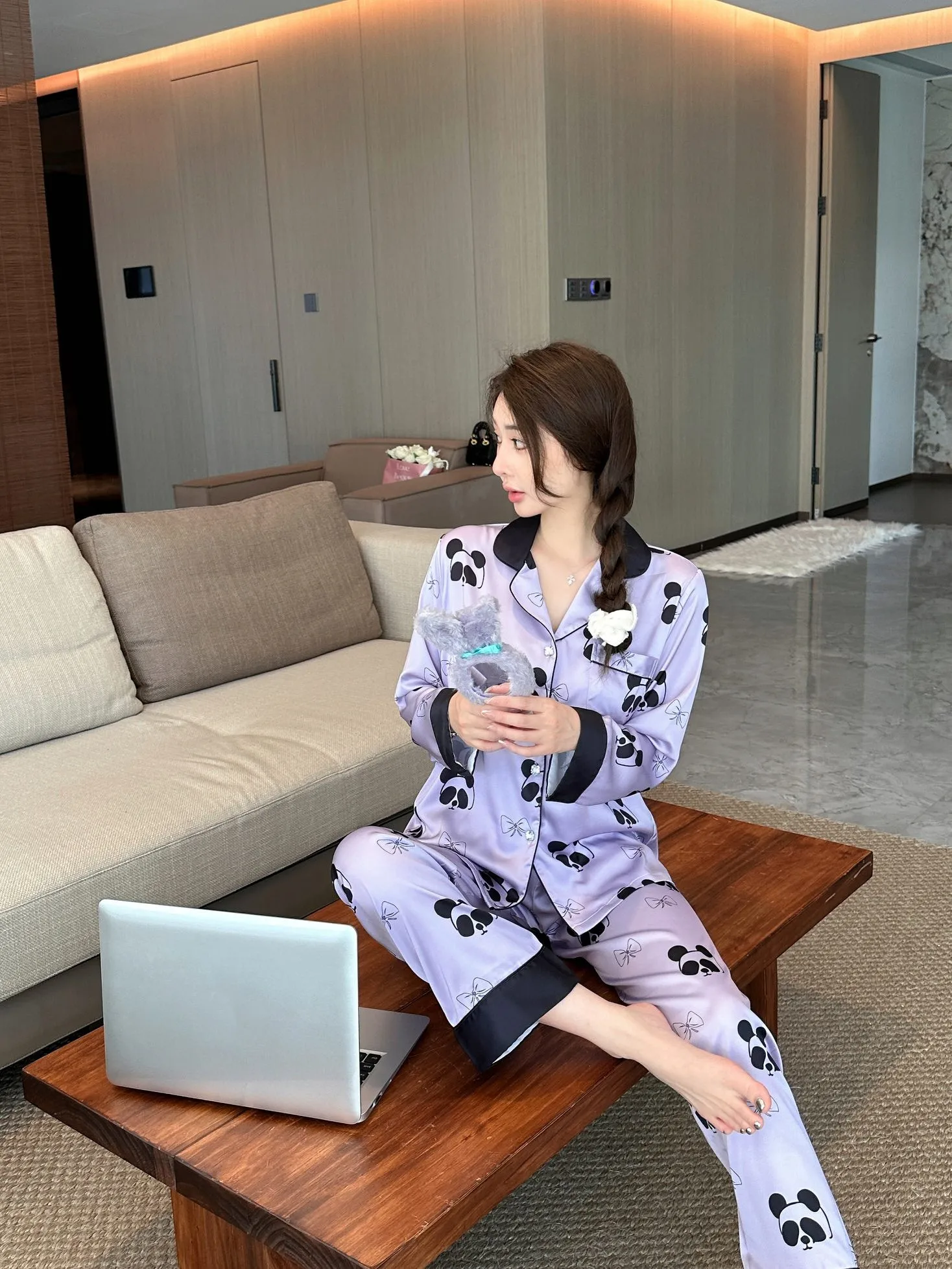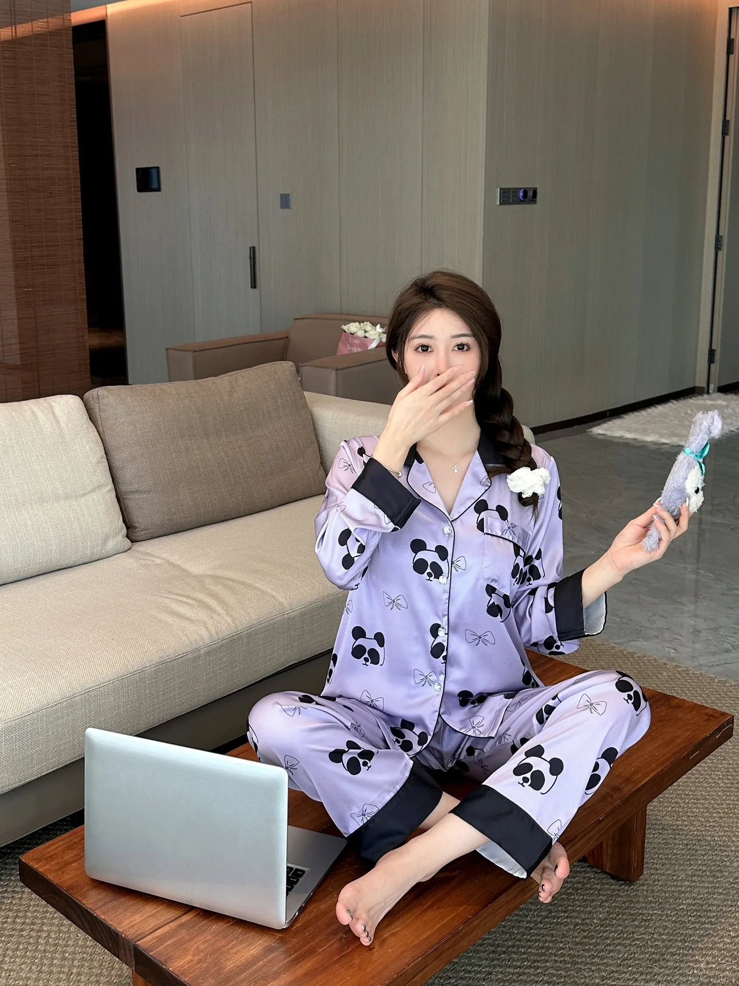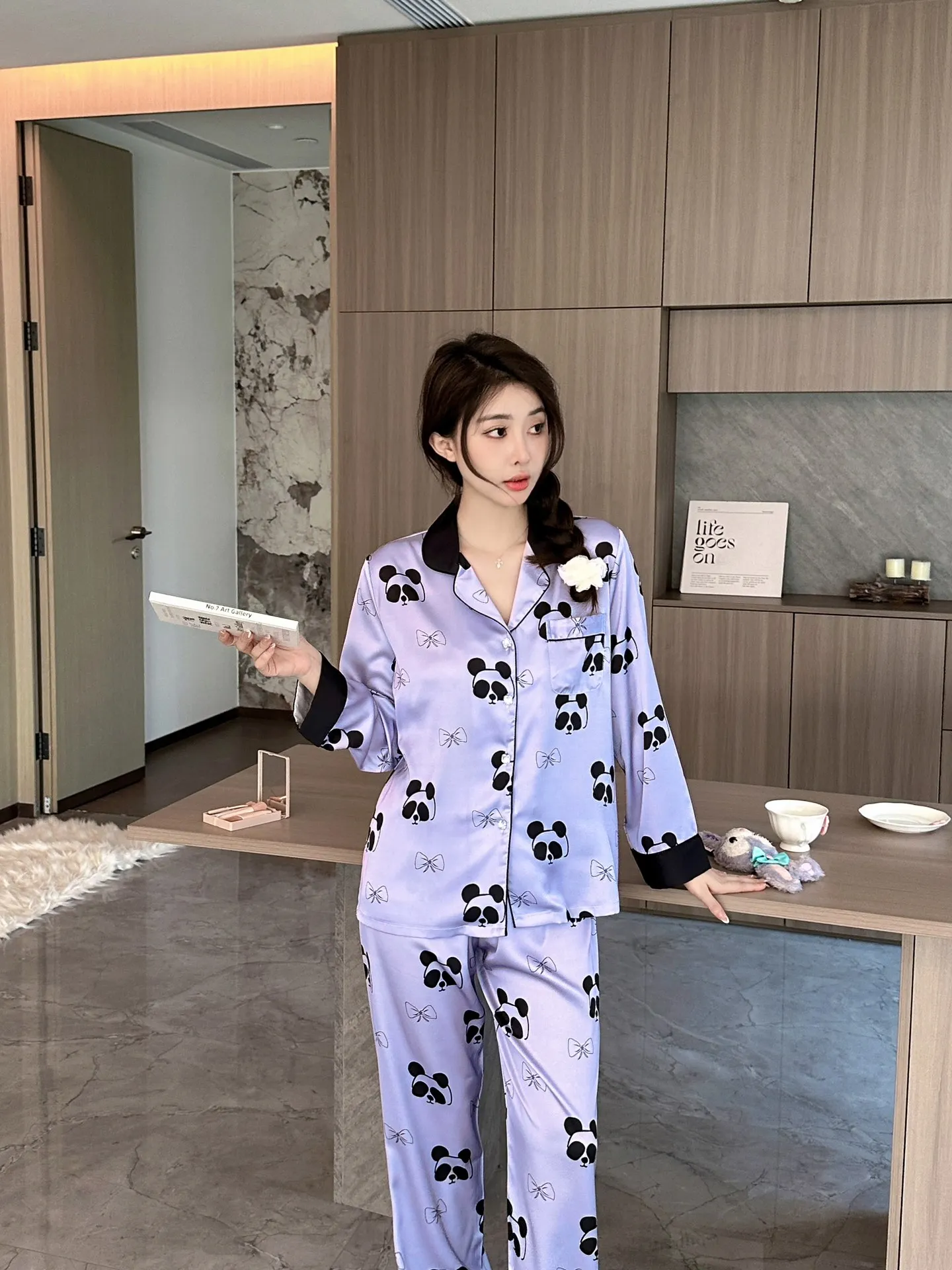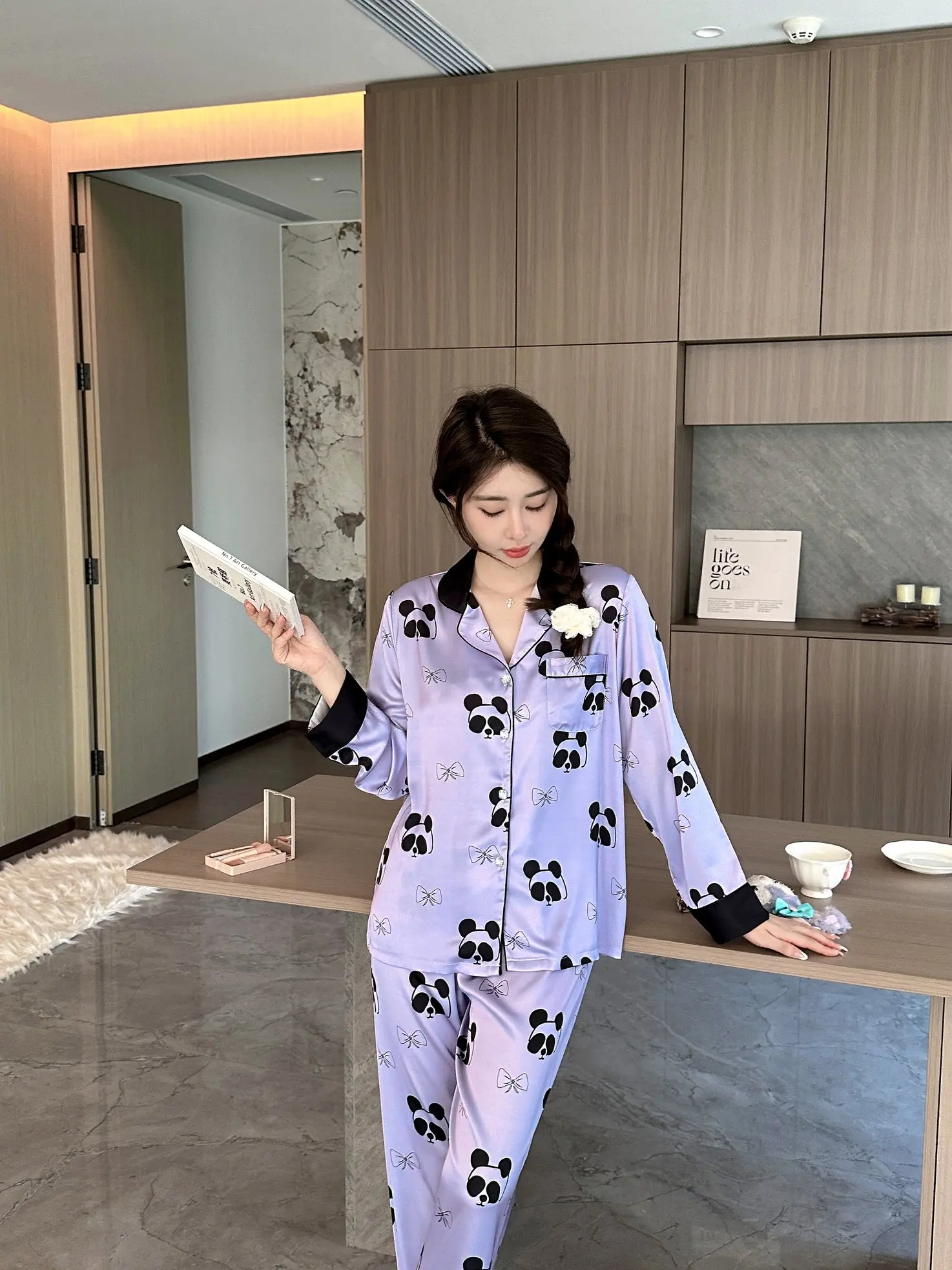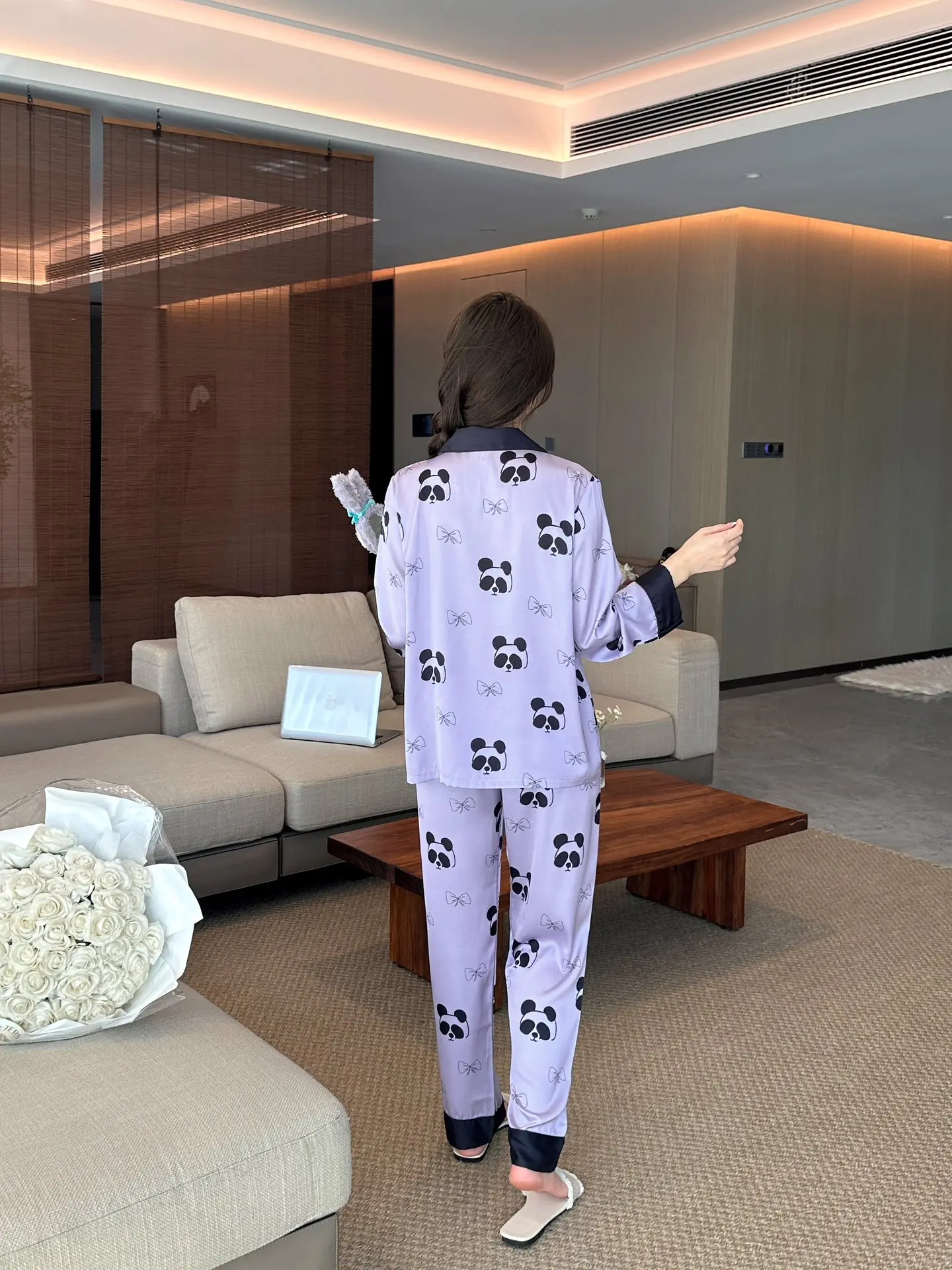 2024 fall new women's ice silk pajamas V-neck thin trousers long sleeve night suit purple panda cartoon print ladies' home wear |