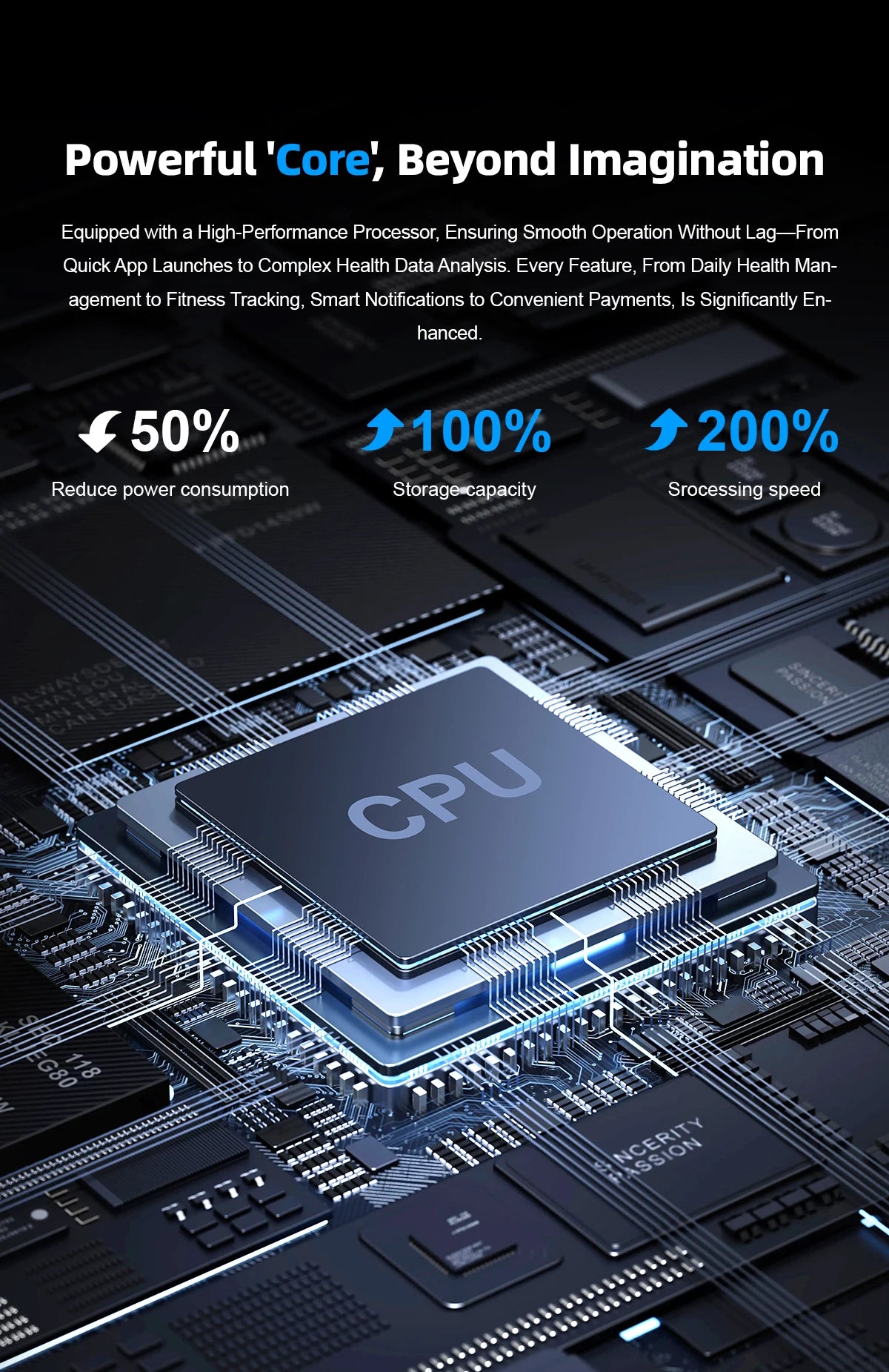 Dial market, QR code connection, multiple UI menus, voice calls, OTA upgrade, step counting, calorie tracking, sports modes, lift-to-wake screen, sleep monitoring, incoming call reminder, message notification, sedentary reminder , alarm clock reminder , stopwatch , dial switching , 3D dynamic dial , music playback , breathing training , hourly measurement , heart rate , blood pressure , blood oxygen level measurement , calculator , custom dial design,brightness adjustment,weather forecast,independent alarm clock ,sports trajectory ,games and other new features. Swipe left on the dial desktop: switch to the first-level menu; swipe right to access the quick menu. Swipe up for message interface; swipe down for Bluetooth call switch settings,brightness adjustment,power saving mode and do not disturb mode. Voice assistant.