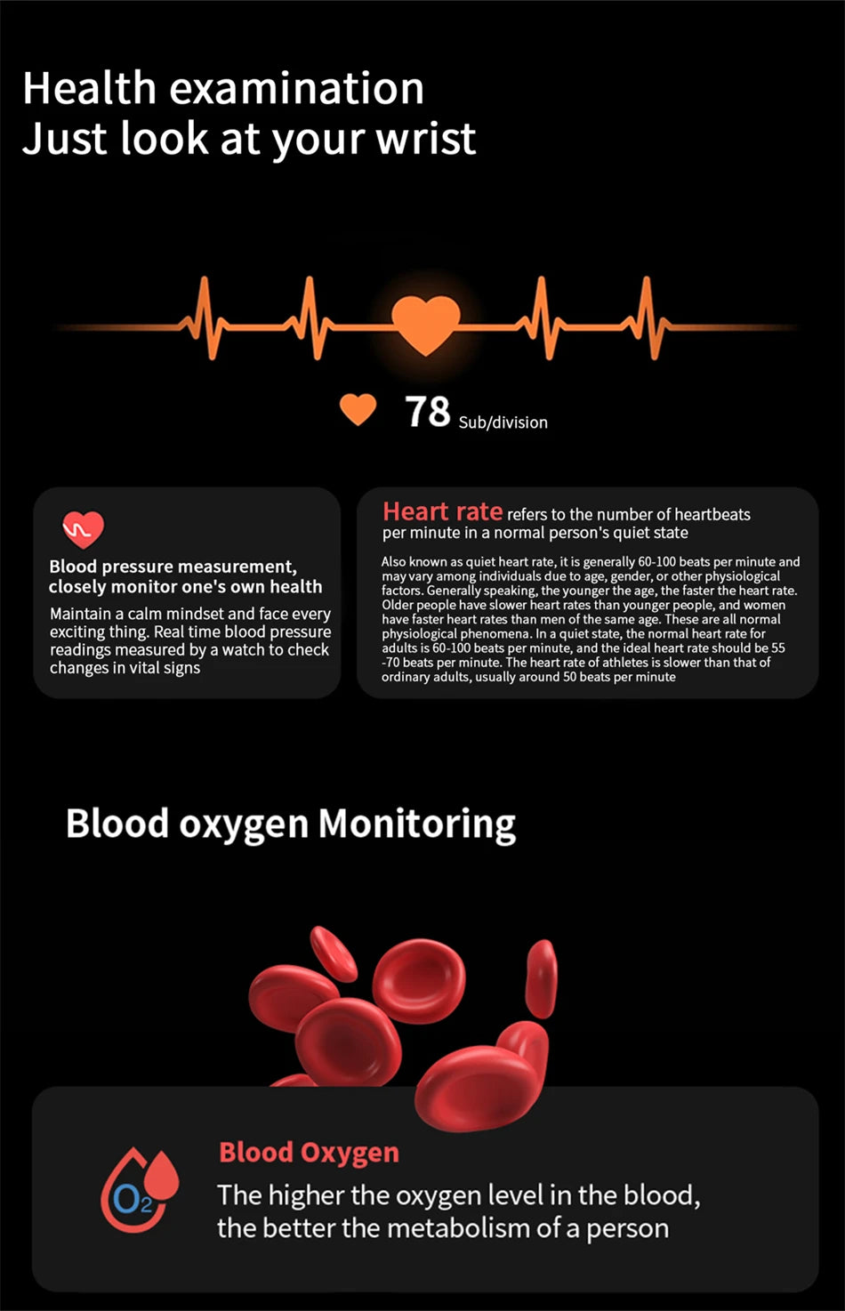 ➤Health monitoring: Blood pressure, heart rate, blood oxygen, sedentary reminder, sleep monitoring, automatic heart rate monitoring, etc.