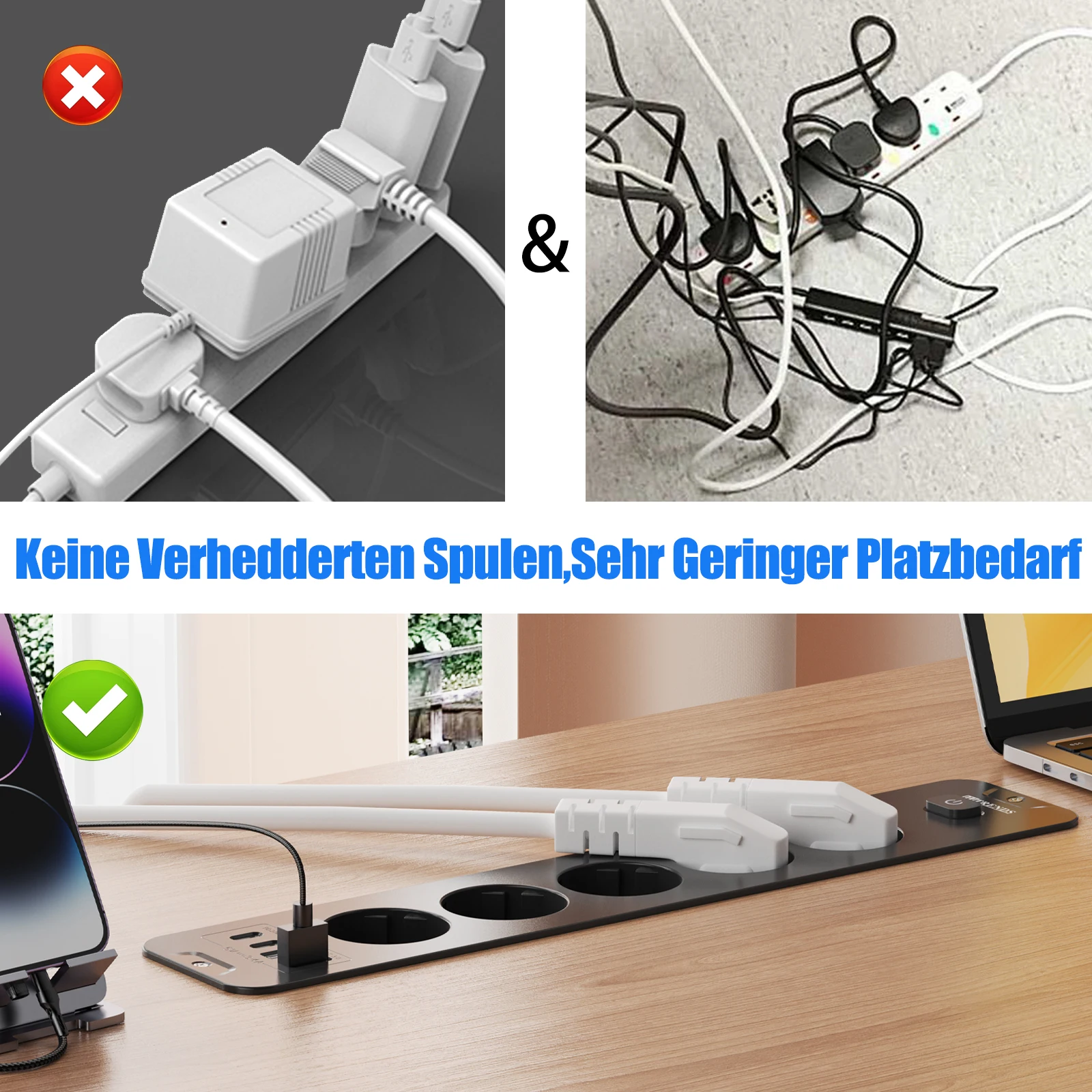 2. SPACE SAVING DESIGN Built in hidden socket with USB port closes flush with the desk and fits in offices, drawers and bedside tables. The tabletop socket with 2m extension cord gives you the flexibility to charge in remote sockets and hard-to-reach places.