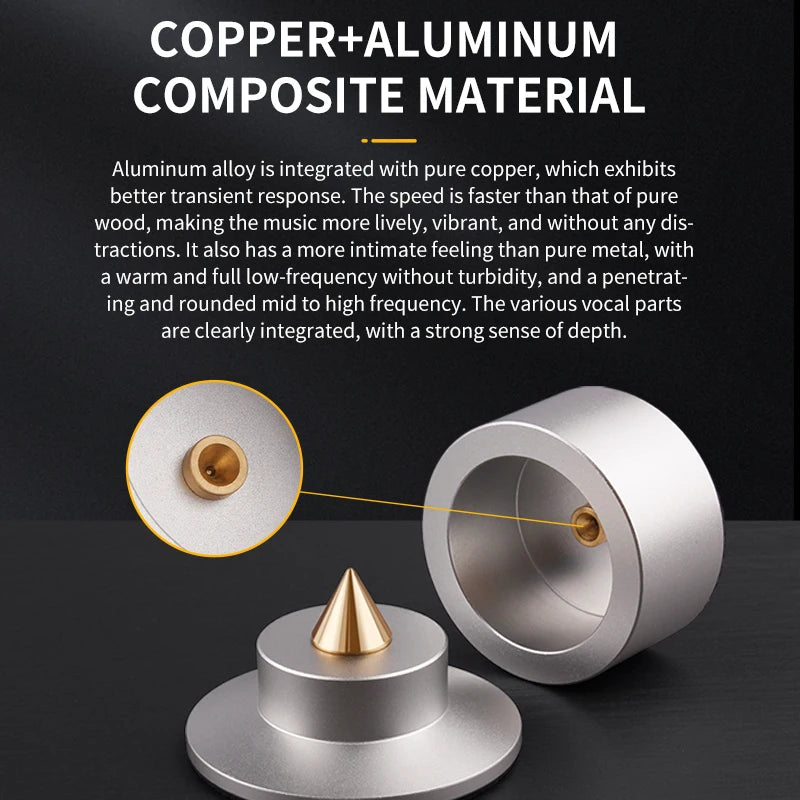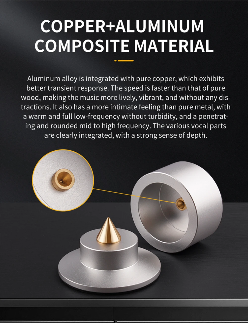 4: COPPER + ALUMINUM COMPOSITE MATERIALAl uminum alloy is integrated with pure copper , which exhibits better transient response . The speed is faster than that of pure wood , making the music more lively , vibrant , and without any dis -tractions . It also has a more intimate feeling than pure metal , with a warm and full low-frequency without turbidity , and a penetrat -ing and rounded mid to high frequency.The various vocal parts are clearly integrated,with a strong sense of depth