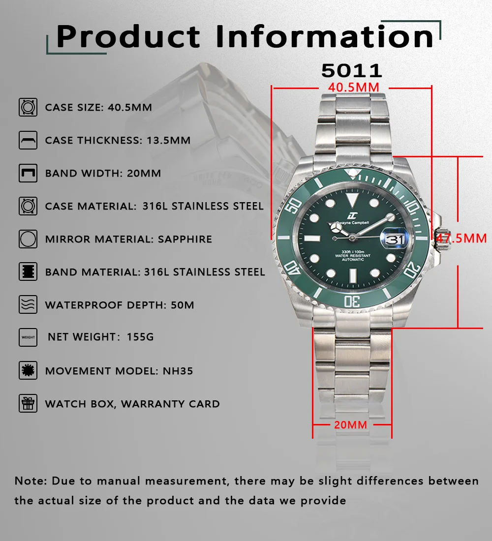 Đồng hồ cơ 40.5mm NH35, kính sapphire chống nước
