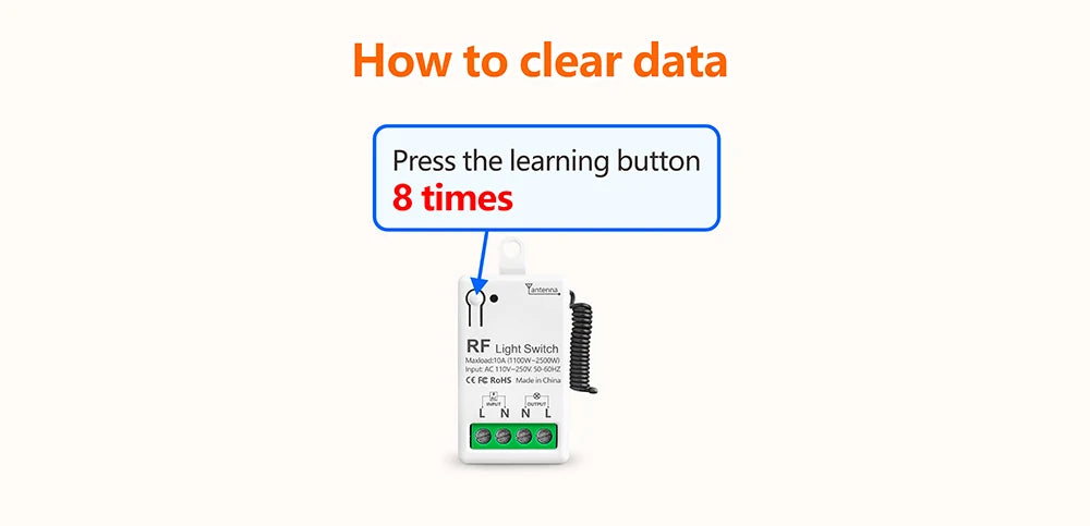 Press the learn button (on the receiver) 8 times. Existing data will be successfully deleted.