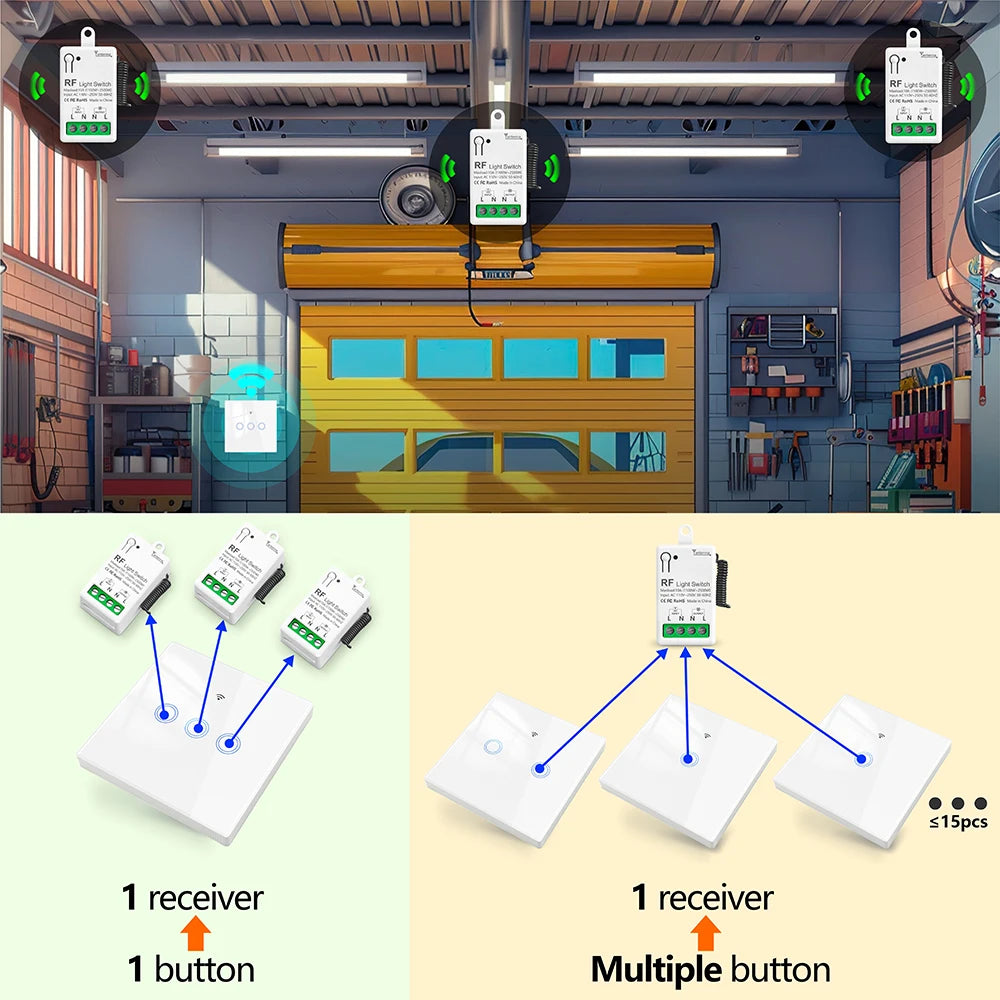 Different buttons on the wireless panel switch can control different receivers respectively, and one receiver can be controlled by multiple wireless panel switch.