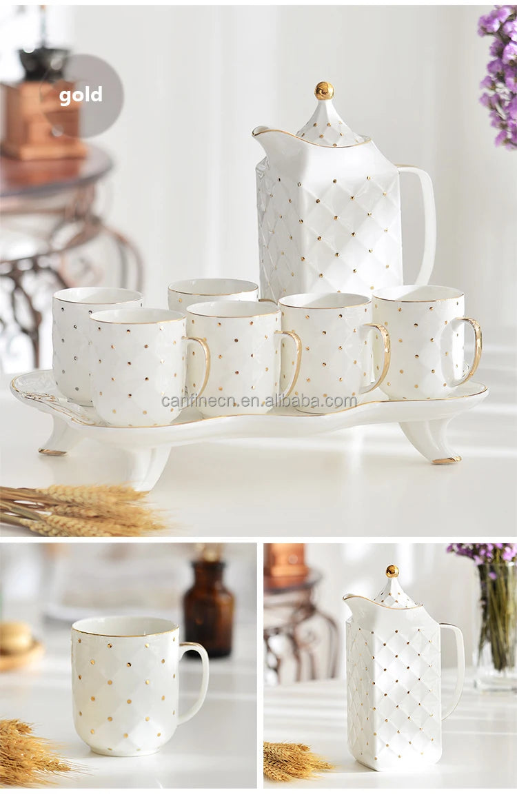Bộ sản phẩm 8 tách & đĩa lót cà phê sứ với thiết kế men màu sang trọng kết hợp viền vàng sẽ mang đến sự quý phái cho không gian sống của bạn. Sản phẩm đi kèm ấm trà sứ và khay, tạo nên sự đồng bộ hoàn hảo cho những buổi thưởng thức trà hoặc cà phê. Được chế tác từ chất liệu sứ cao cấp, bộ sản phẩm không chỉ bền đẹp mà còn an toàn cho sức khỏe. Đây là lựa chọn lý tưởng cho những ai yêu thích phong cách tinh tế và đẳng cấp.
