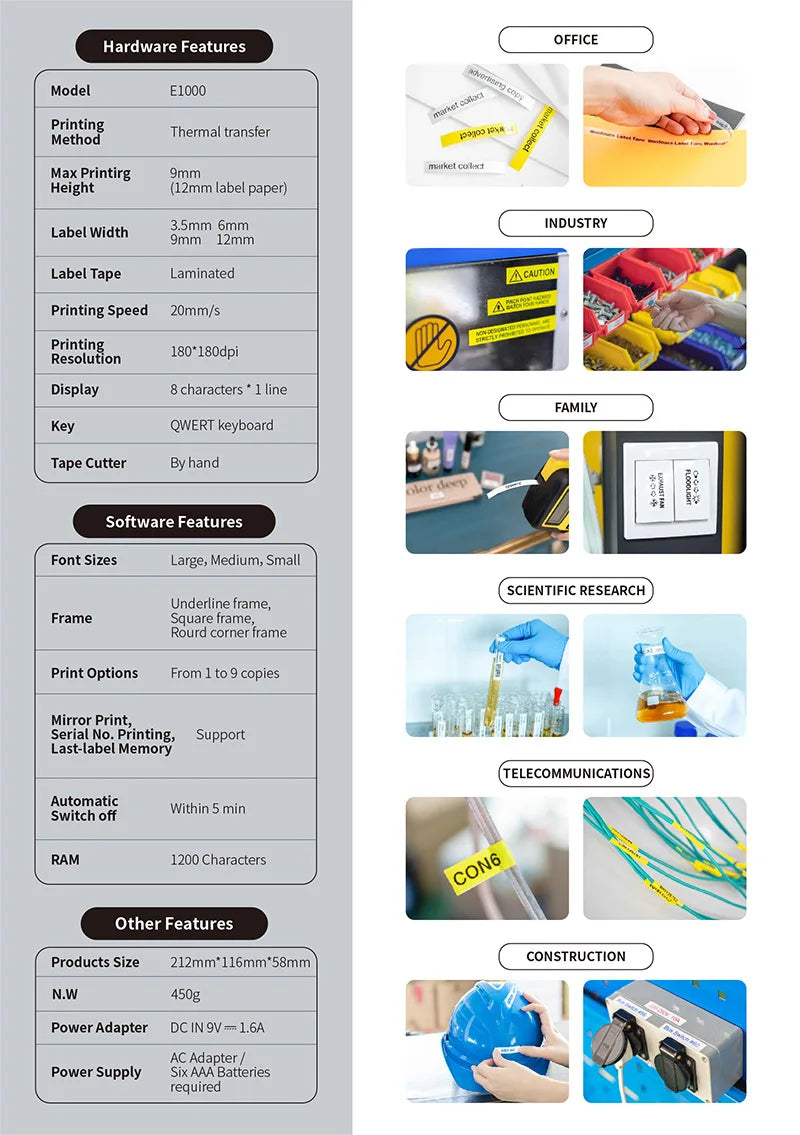 Package including: 1 printer + 1 flexible label tape + 1 power supply + 1 instruction manual