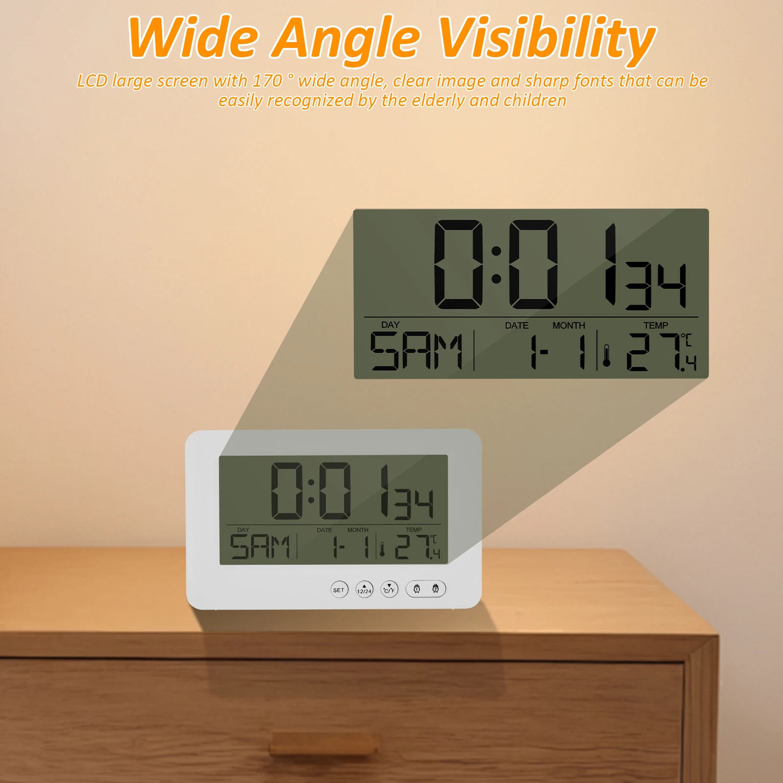 HD Large Screen : The LCD large screen is paired with a 170° wide angle view , delivering clear visuals and text . Placing it on a bedside table or desk ensures that the time is clearly visible from any angle , making it easy for the elderly and children to identify and read the information.