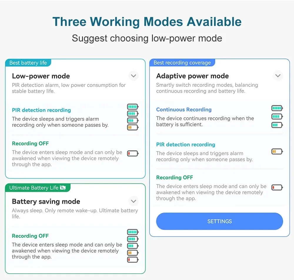 *This solar camera has three working modes.We suggest you low power mode.