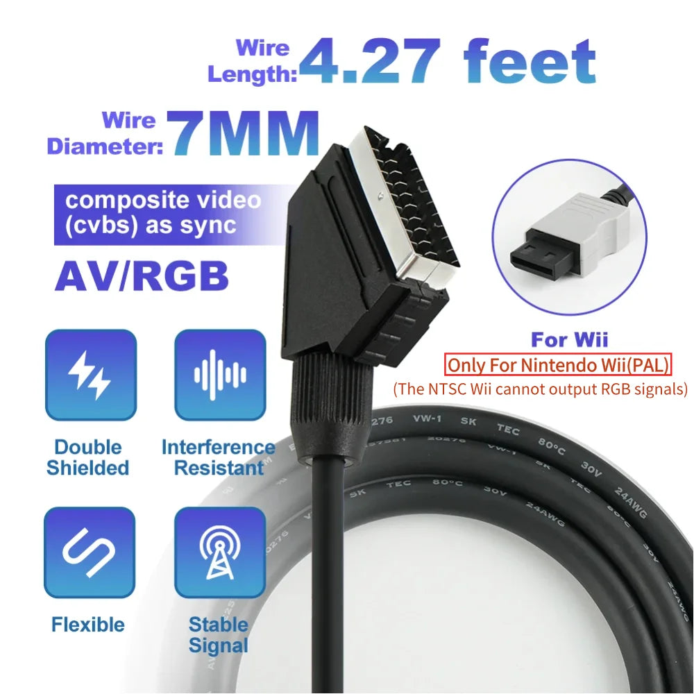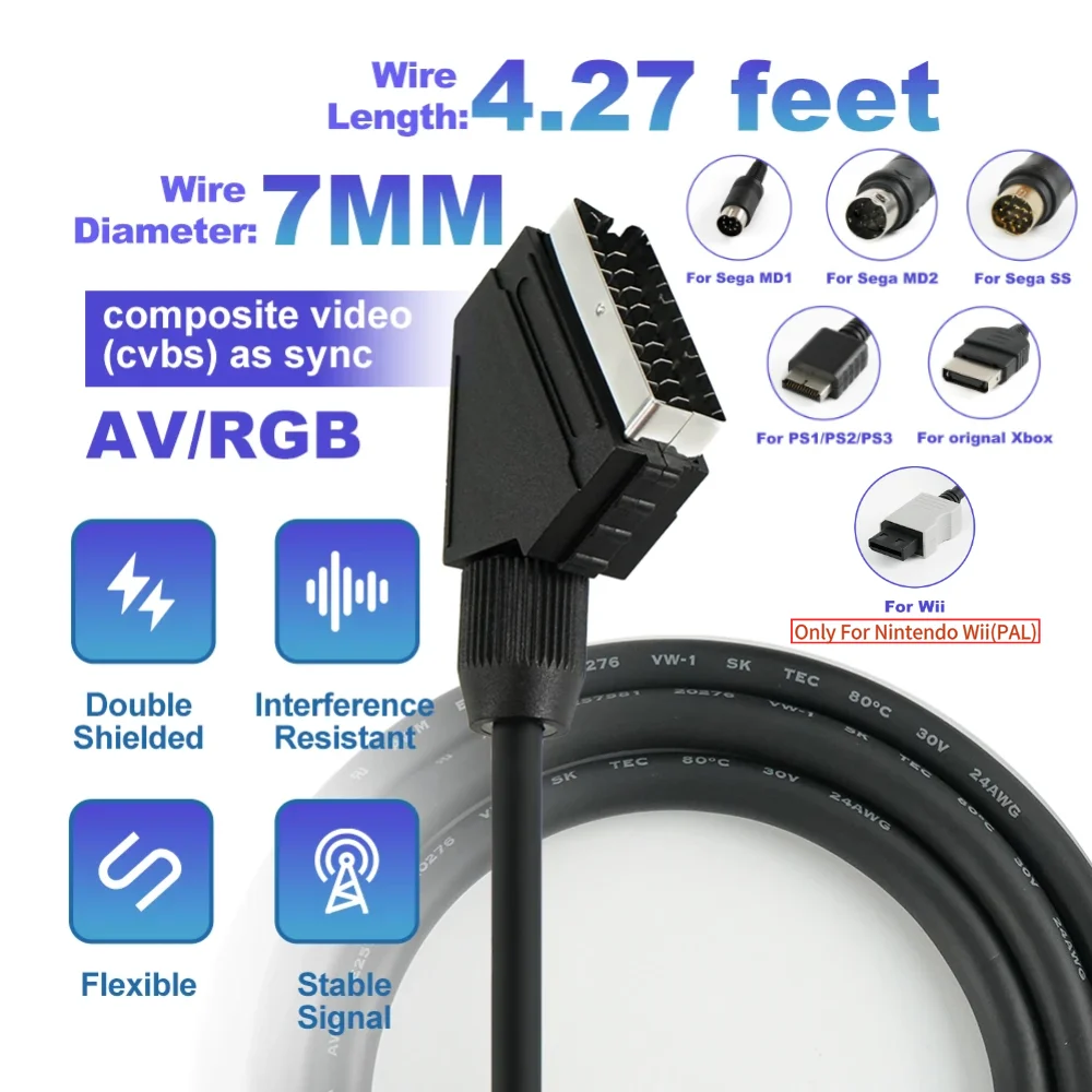 Cáp RGB SCART 1.3m Cho Console Game Cổ Điển Retro