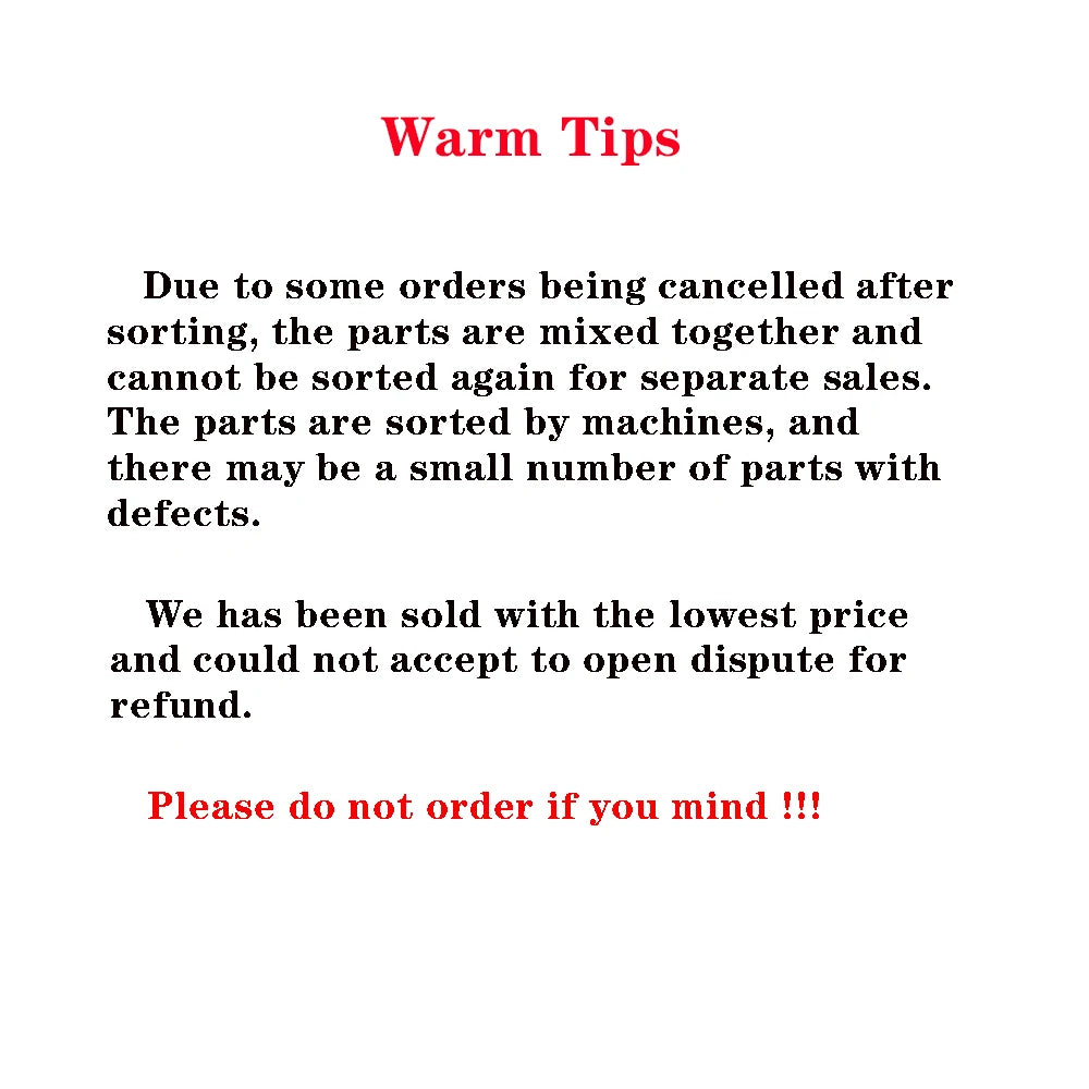 Due to some orders being cancelled after sorting, the parts are mixed together and cannot be sorted again for separate sales. The parts are sorted by machines, and there may be a small number of parts with defects.