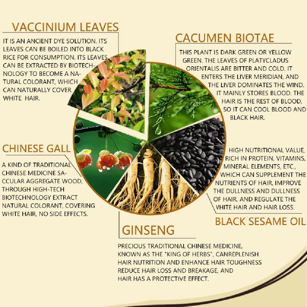 1.This hair dye cream contains various botanical ingredients such as vaccinium leaves, cacumen biotae, chinese gall, black sesame oil, ginseng, which is safe and healthy, easy to color, and easy to clean.