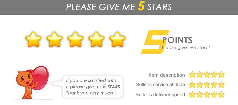 Please give me good Feedback If the product has any problems, please send order message for me. I will promptly solve this problem. Disputes and bad feedback can not solve any problem. 1.Buyer's early confirmation will be highly appreciated after receiving the items. 2.Since your feedback is very important to our business's development, we sincerely invite you to leave positive feedback for us if you are satisfied with our product and service. It'll just take you 1 minute, but this 1 minute has the proportion Significance to us. 3.Please contact us before disputes or any negative or neutral feedback. We will work with you to solve any problems.Thank you for your understanding! Tax: 1 We depend on our customer satisfaction to succeed. Therefore, your feedback is extremely important to us. 2 If you are satisfied with our items, please leave us positive feedback. We will leave a positive feedback to you later. 3 Contact us by e-mail or our trade manager yet again, any negative or neutral feedback. We will deal with you to solve any problems as soon as possible.