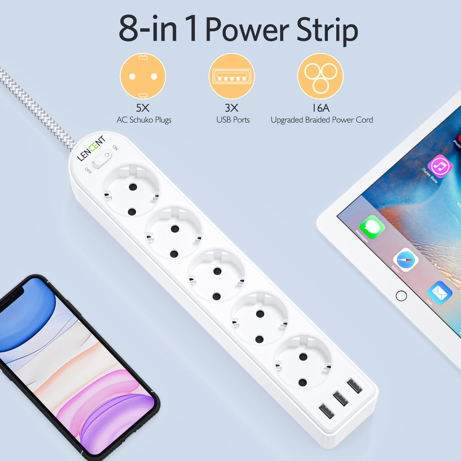 LENCENT - Ổ Cắm Đa Năng 8 Trong 1, 5 Ổ Cắm, 3 USB