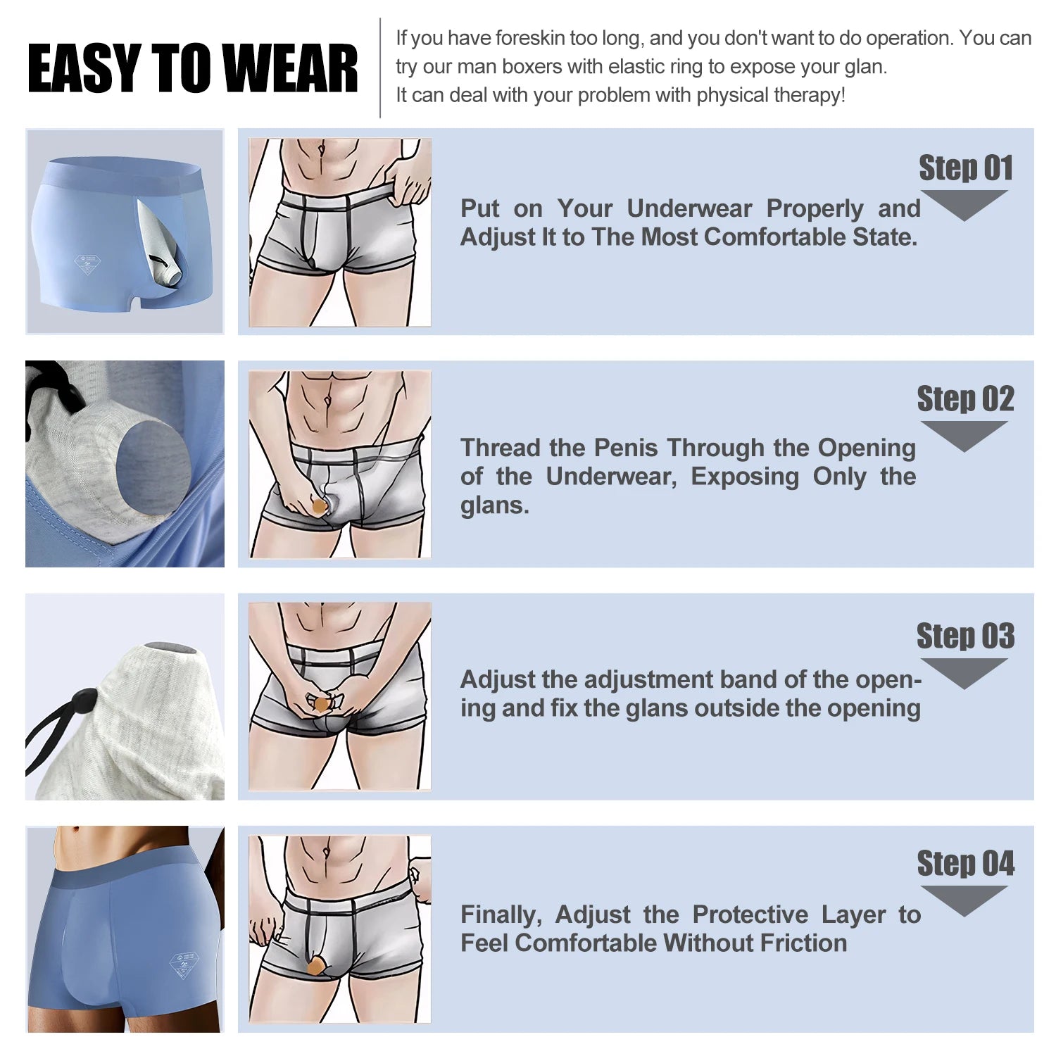 Physical desensitization: Separate corrective underwear for men exposes the glans through a front opening design, reducing sensitivity and helping users with foreskin too long gradually adapt to external friction.