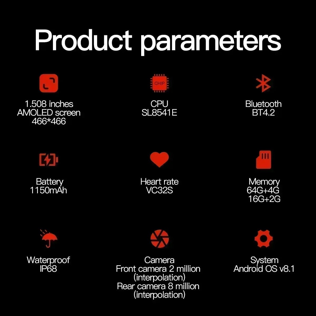 4. 1.508 inch AMOLED Round screen with a resolution of 466*466, 800W Dual camera;