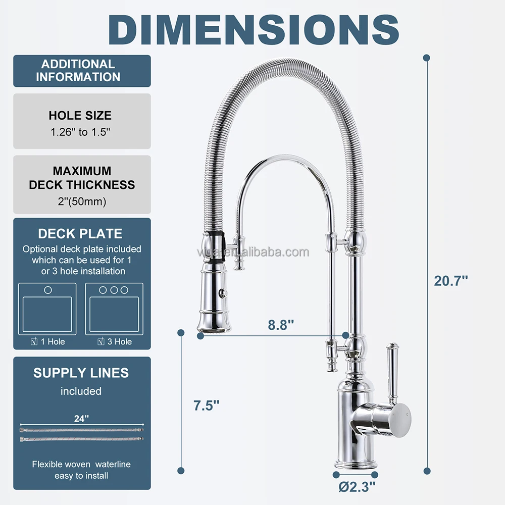 1 or 3-hole installation, optional 9.6” deck plate provided. Pre-installed water hose in 3/8" female compression thread, 1/2" adapters coming with |