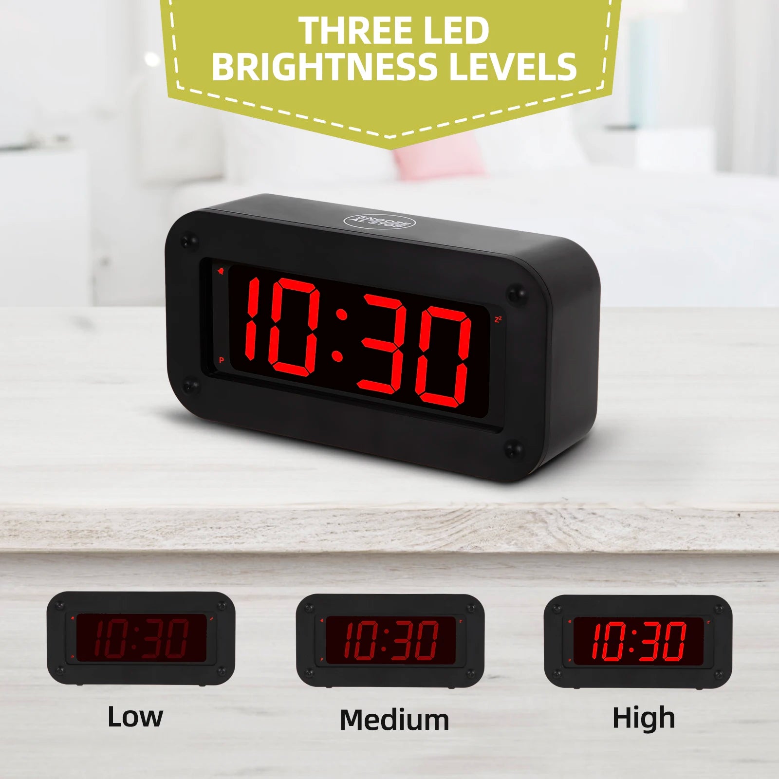 LED Display Only, Three Adjustable Brightness - There is no LCD display for this clock, LED stays on with battery only. There are three adjustable brightness, low-medium-high. To conserve battery life, the clock automatically enters night mode from 8:00 p.m. to 6:00 a.m. by dimming to low brightness, overriding the manual setting.