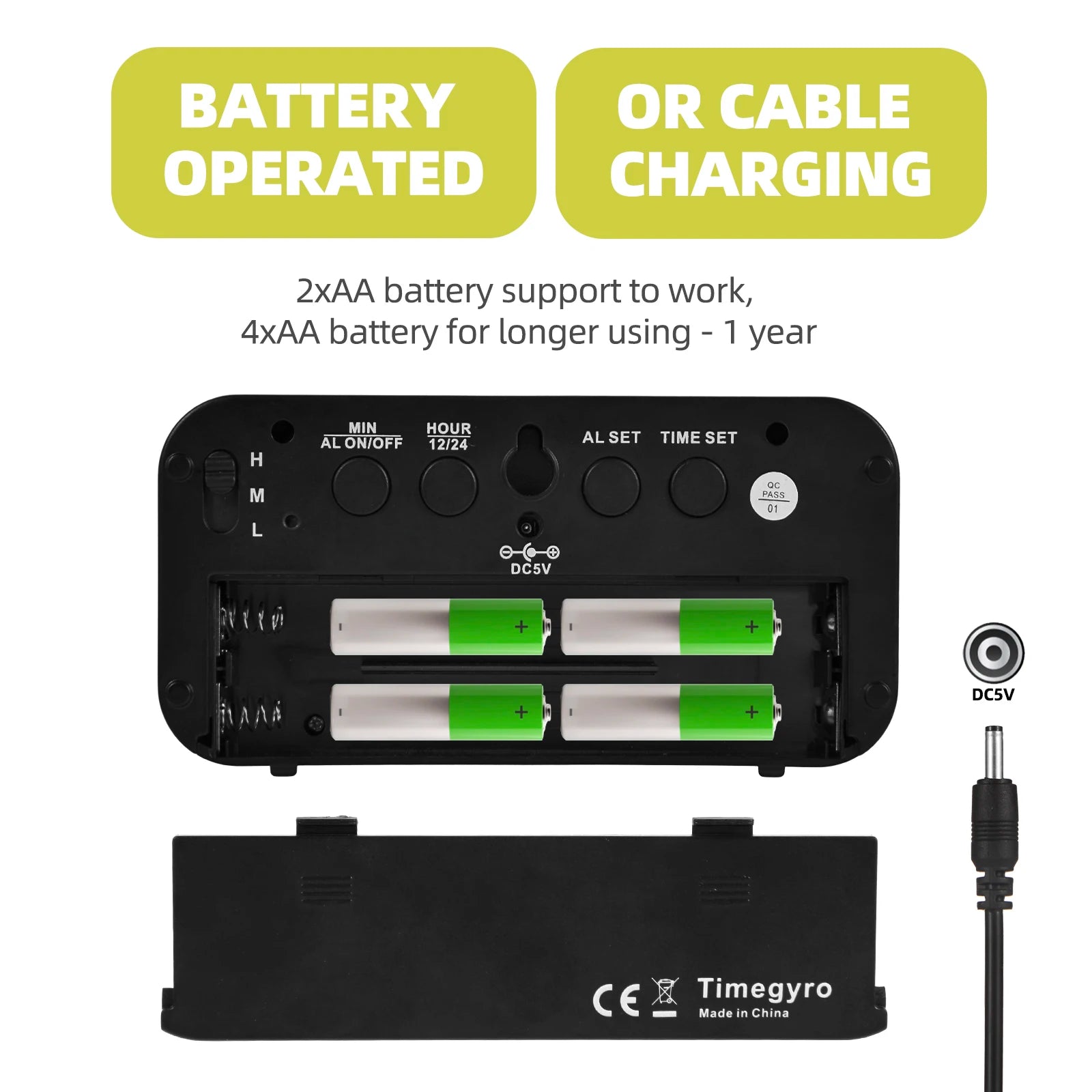 Digital Clock Battery Powered, with Power Cord - With two power supply methods, the clock can be powered by battery only or by plug in (battery not included). When by battery only, 2xAA battery can support it work and 4xAA battery can extend the using time to be 1 year or more.