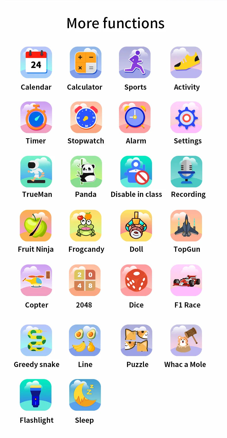 Function: Shock Resistant,Passometer,Chronograph,Alarm Clock,World Time,Calorie Counter,week,Month,Interactive Music,Noctilucent,Calendar,Countdown,Calculators