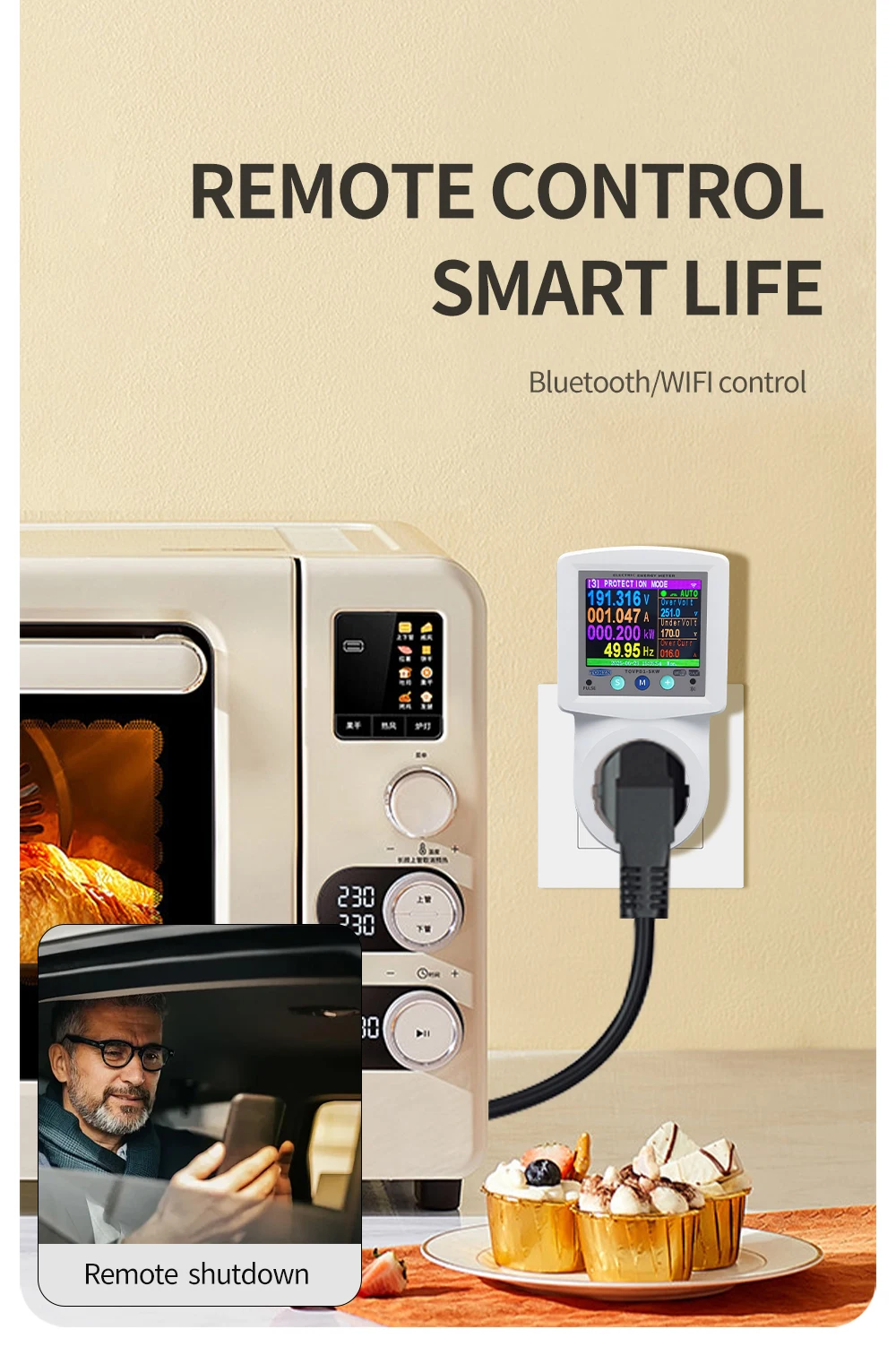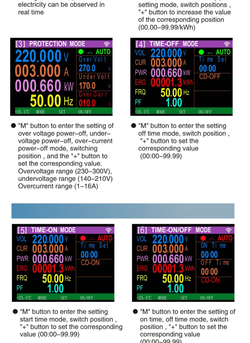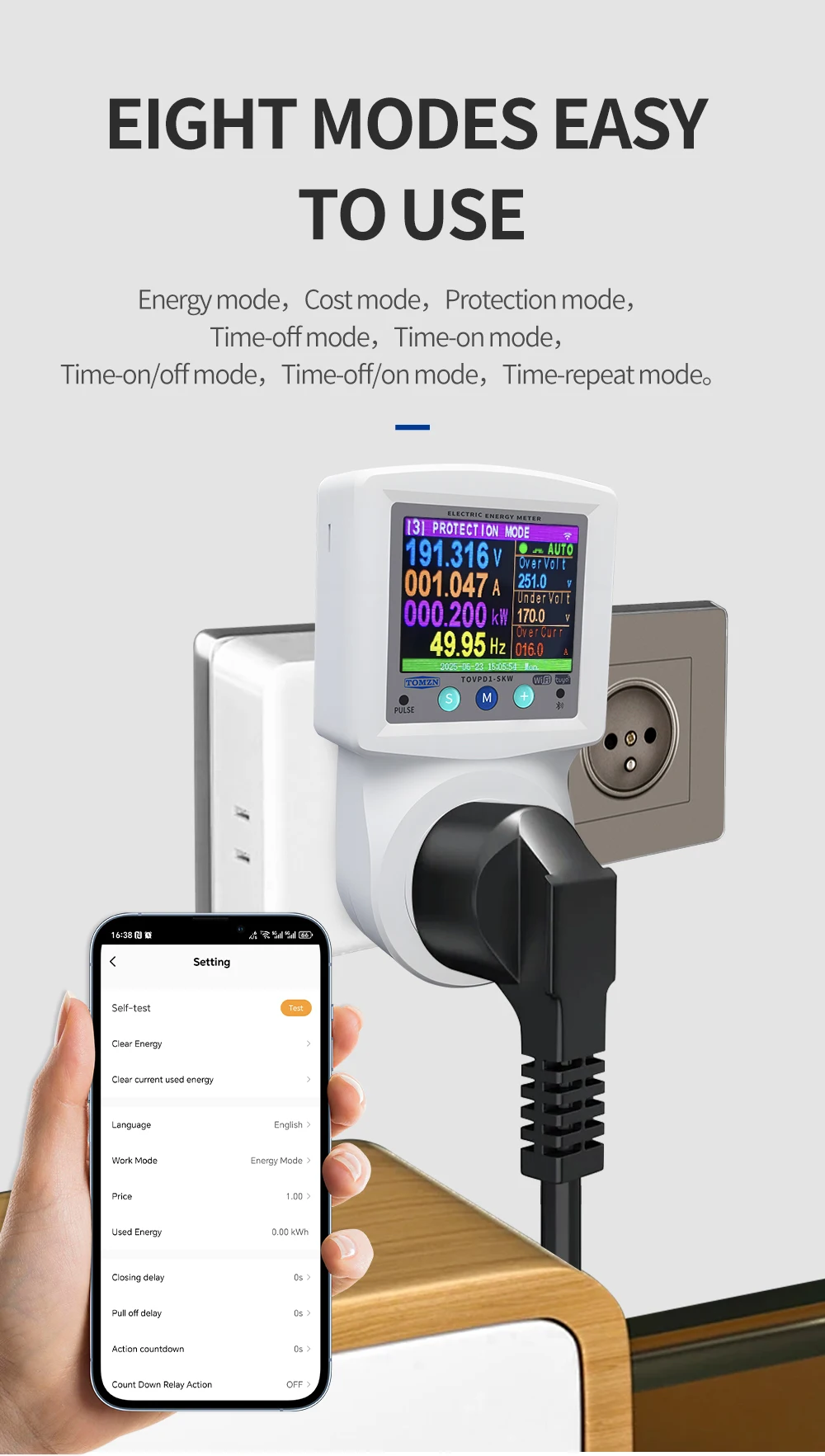 1. Energy mode: display Voltage、Current、Power、Energy、Frequency、Power factor
