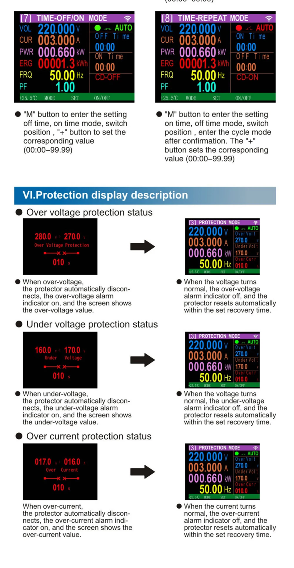Over-Voltage: Protection range 230–300V (default: 270V), recovery 225–295V (default: 265V).