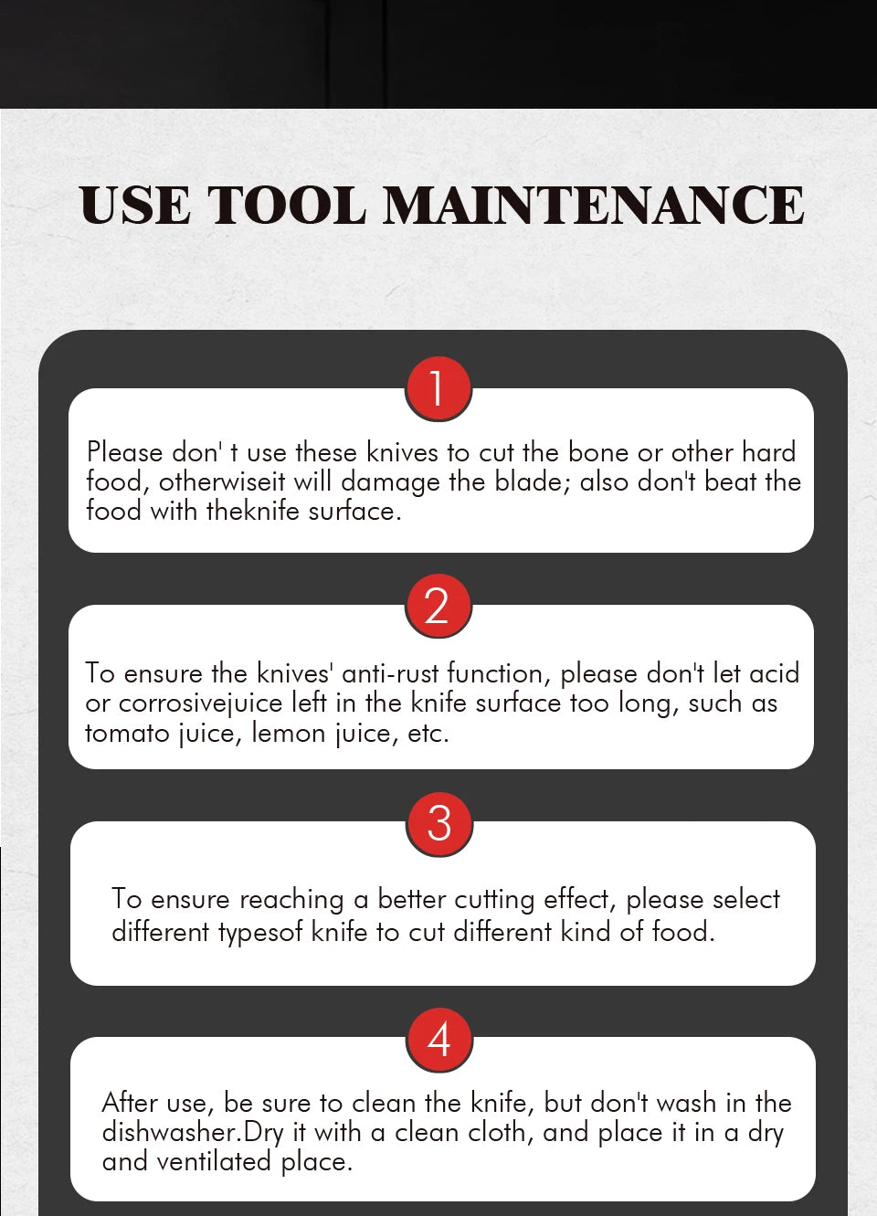 NOTE:Suitable for daily kitchen cooking, cutting meat, slices, vegetables melons etc.(don't use it cut the bone or other hard food)