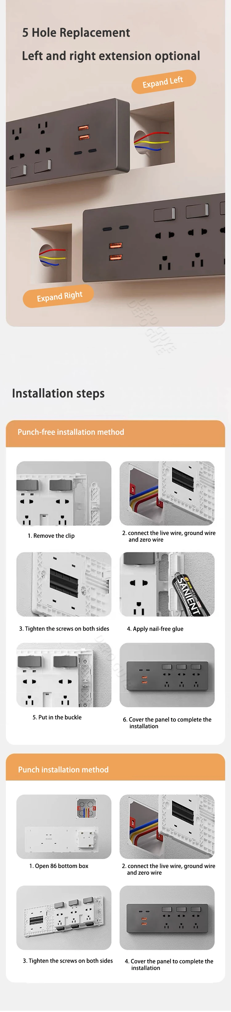 US Mexico Standard Expand Socket,Universal Five Hole 65W Fast Smart Charge USB Port Outlet,UK Wall Power Electric Wall Plug