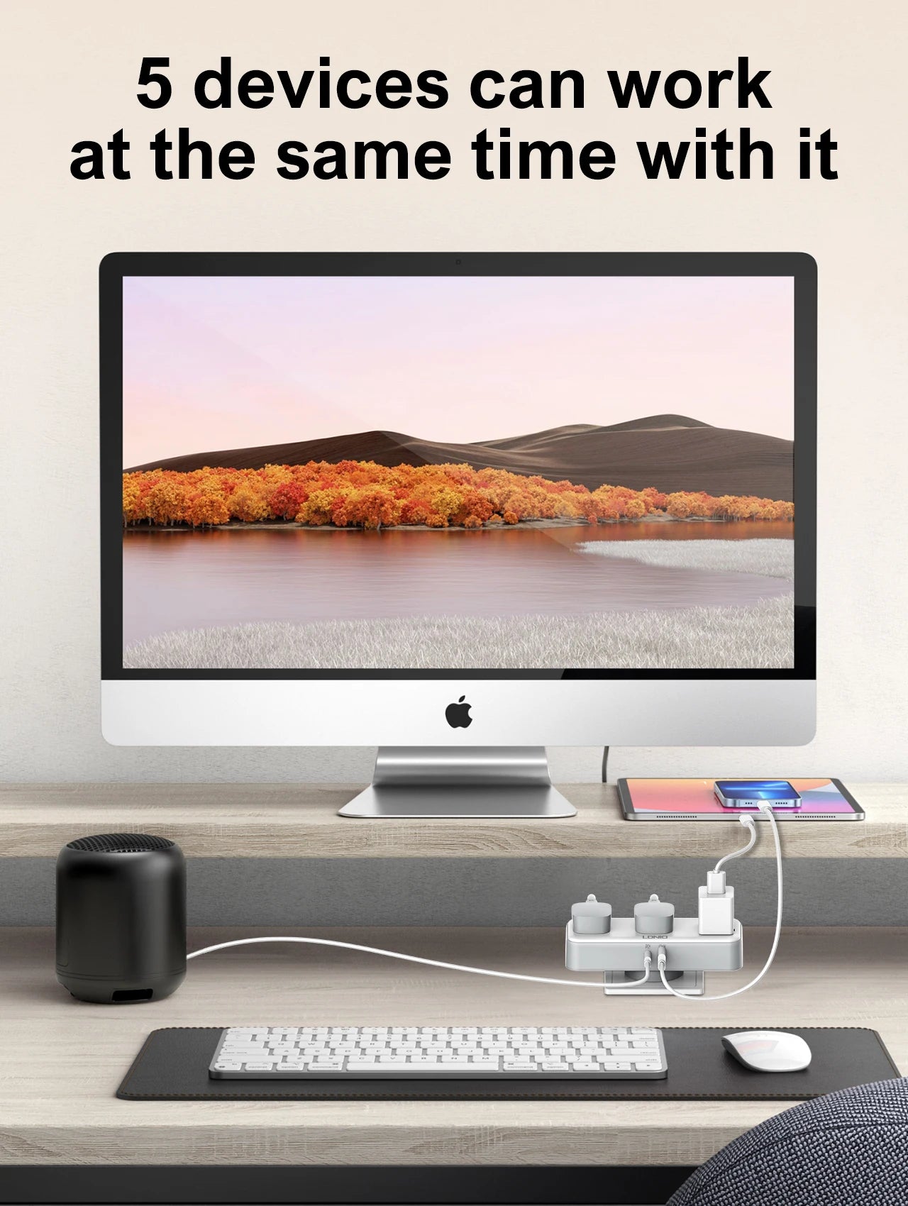 5 devices can work at the same time with it.The power strip features a socket with a USB C port, which provides fast charging for compatible devices.