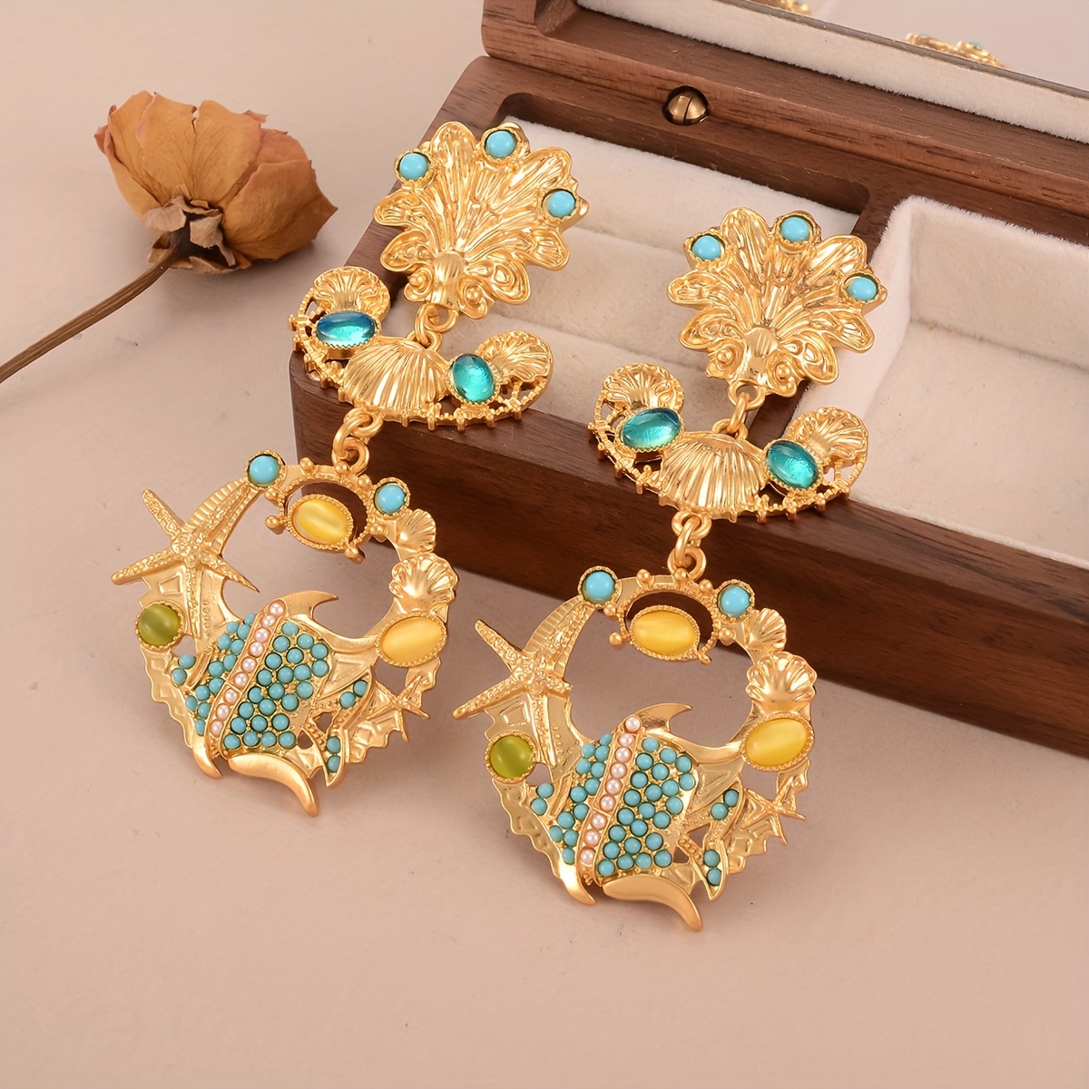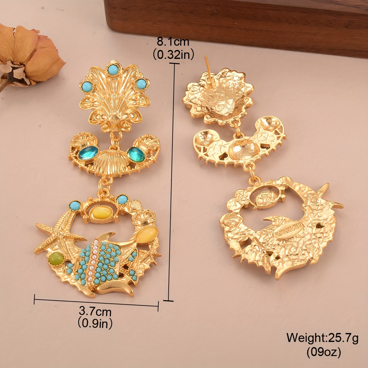 Vintage Boho Ocean-Inspired Drop & Dangle Earrings - 18K Golden Plated with Glass Mosaic, Alloy Construction, 925 Sterling Silver Ear Needle for Women, Ideal for Daily Wear and Gifting Occasions