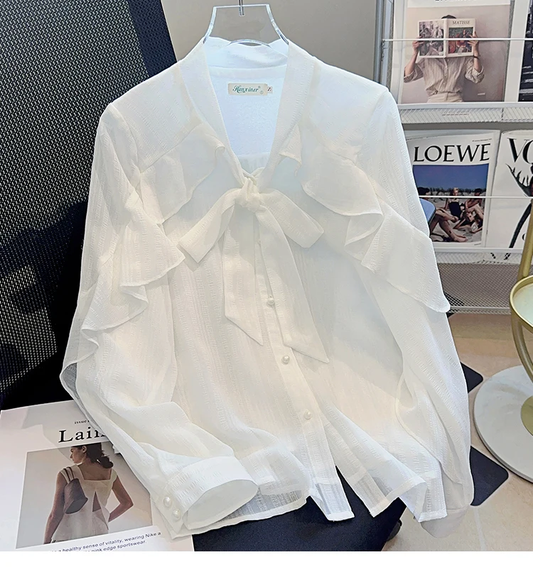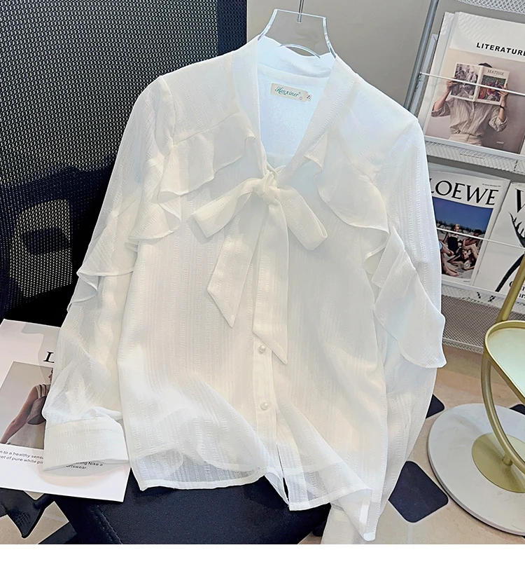 Women Shirt Blouse New Long Sleeve Bow Collar White Chiffon Shirt Blouse Women Tops Blouses Shirts Blusas Para Mujer 2025 Q614