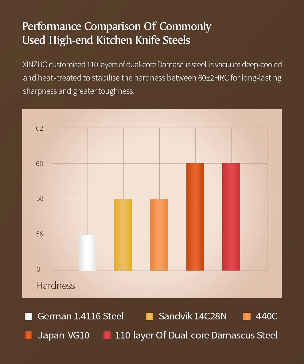 Blade Material:110 layers of dual-core Damascus steel. (10Cr15CoMoV + 9Cr18MoV)