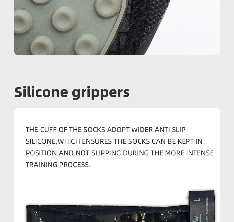 •The cuff of the socks adopt wider anti slip silicone,which ensures the socks can be kept in position and not slipping during the more intense training process.