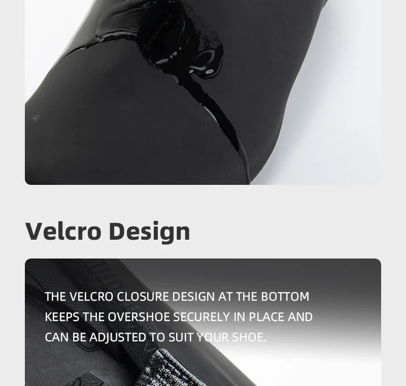 •The Velcro closure design at the bottom keeps the overshoe securely in place and can be adjusted to suit your shoe.