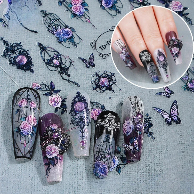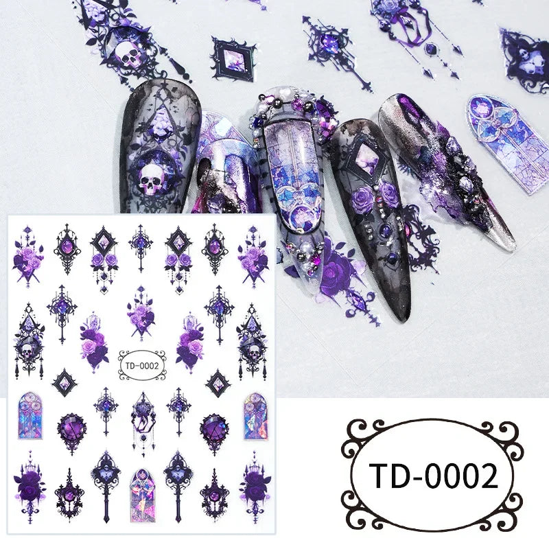 3D黑色紫色萬聖節美甲貼紙 哥德骷髏玫瑰蝴蝶美甲貼花 節日美甲裝飾 美甲滑塊