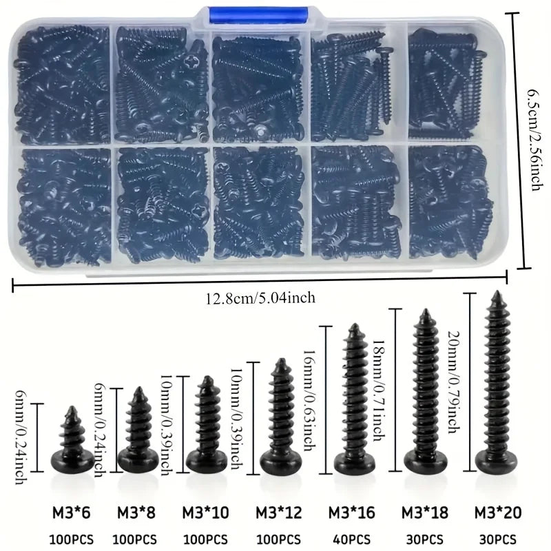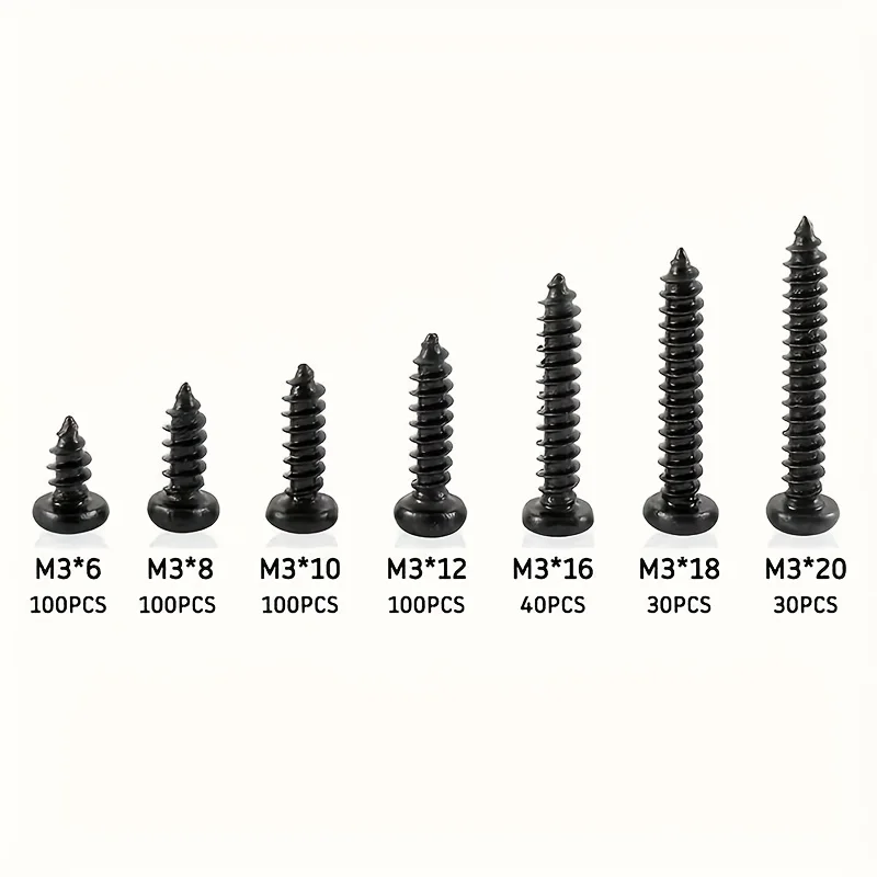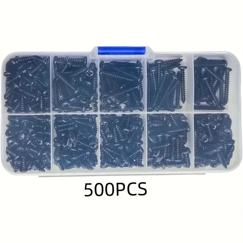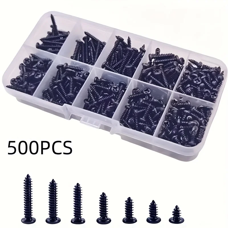 500顆M3黑色自攻螺絲盤頭十字自鑽木螺絲組合套裝碳鋼螺絲