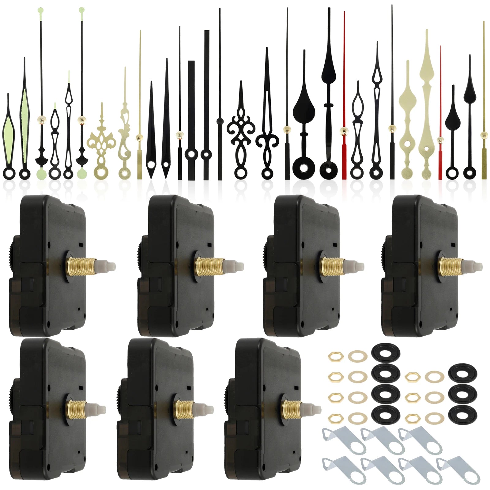 【完整鐘錶機芯套件】此鐘錶機芯套件包含7個石英鐘機芯(3種尺寸)、10種不同款式的指針、7個墊圈和7個掛鉤。此套件非常適合自行維修、更換或組裝鐘錶。使用1顆AA電池供電(不含電池)。