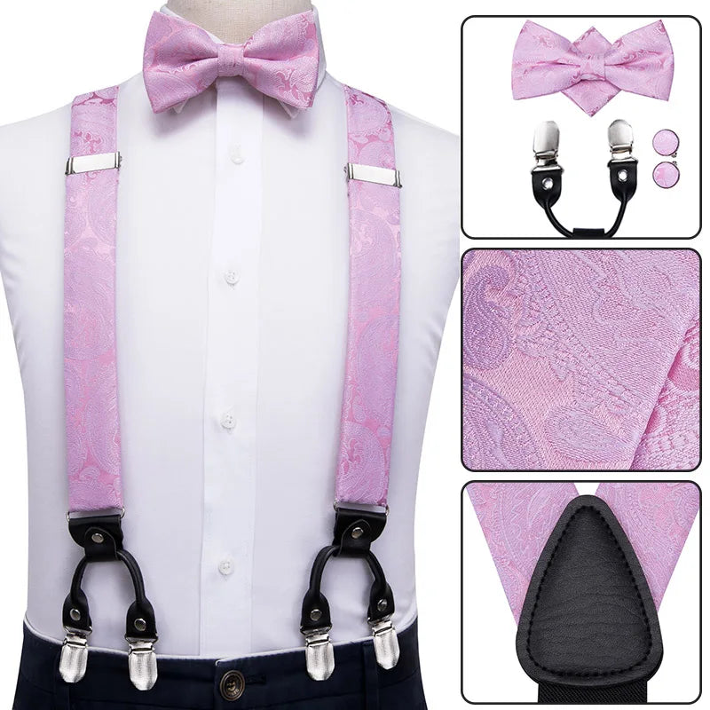 高品質男士紅色花朵絲綢皮革蝴蝶結及皮帶套裝,含6個夾子