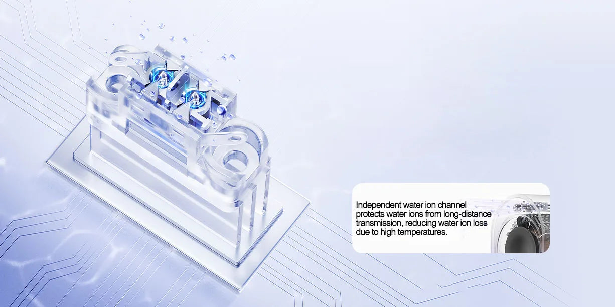 這項突破性的雙針水離子護髮技術能有效冷凝空氣中的水分,並瞬間轉化為奈米級水離子。這些水離子隨後透過獨立的冷空氣通道直接輸送到髮絲,為秀髮提供深層滋養。獨立的水離子通道可防止水離子長距離傳輸,並減少高溫造成的水離子流失。