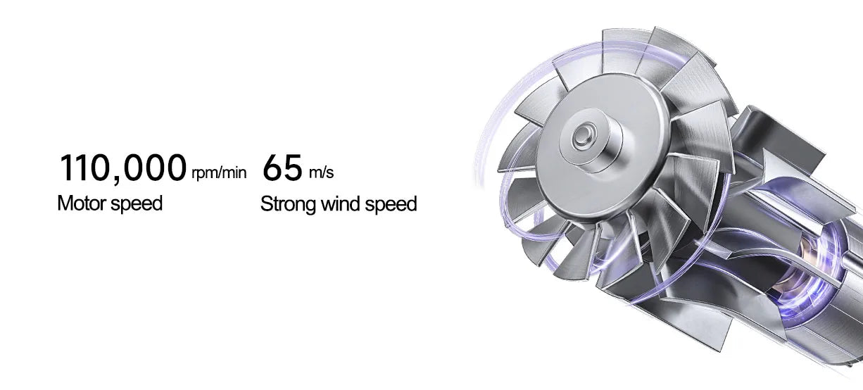 * 110,000 RPM 高速馬達:可提供每秒 65 公尺的強勁風速,快速烘乾。